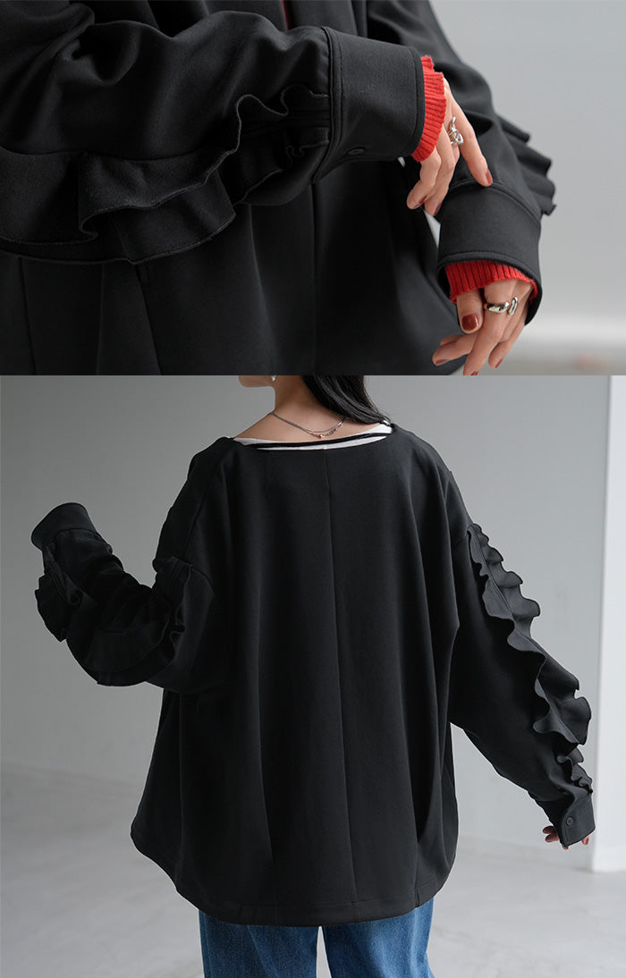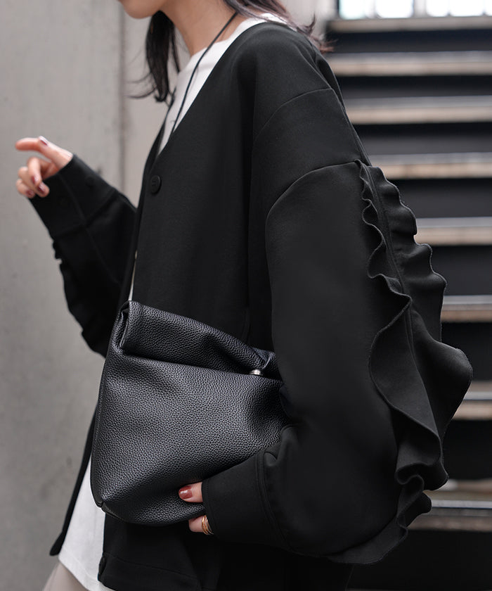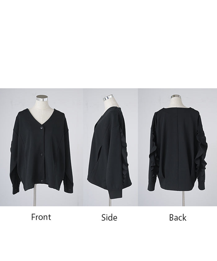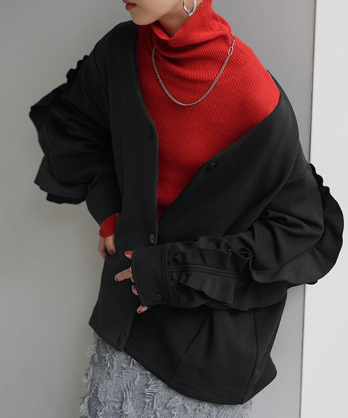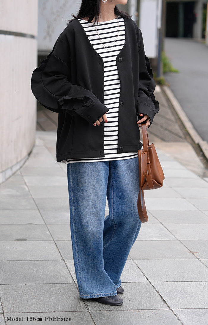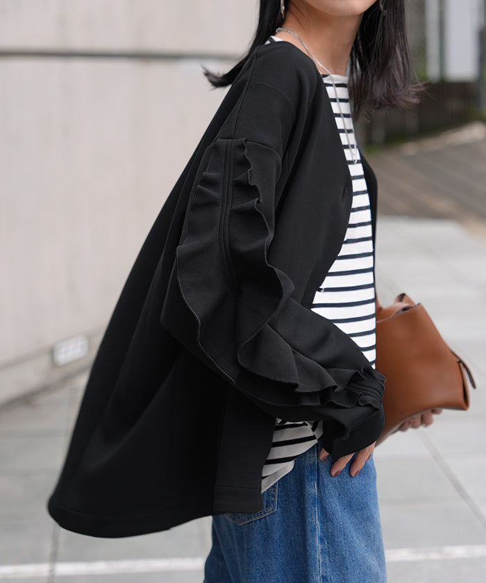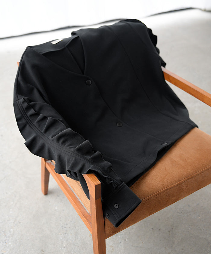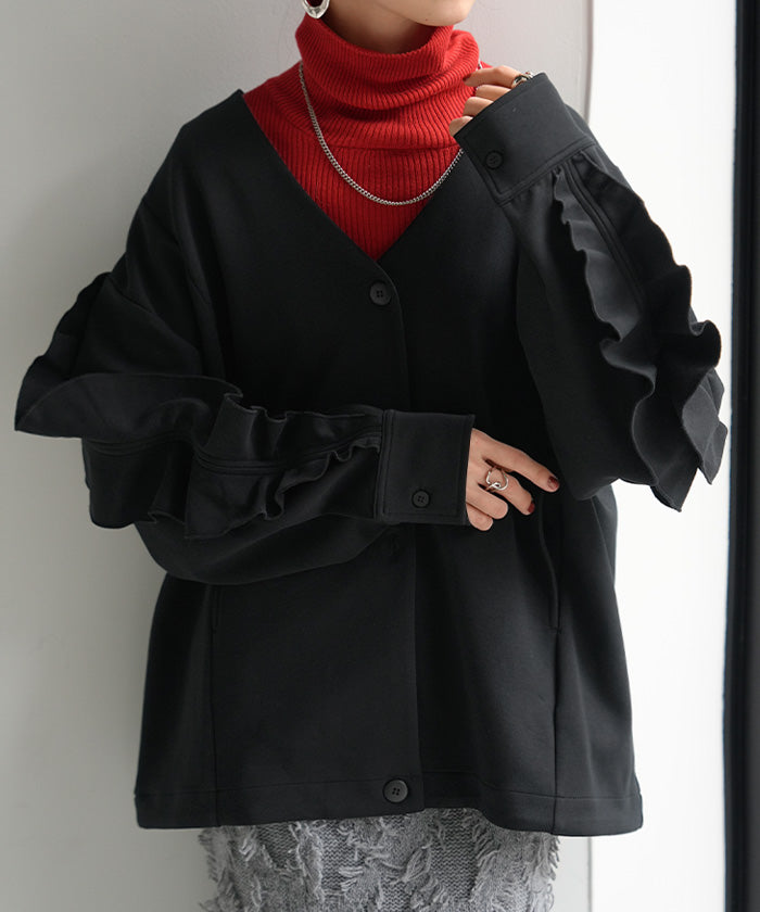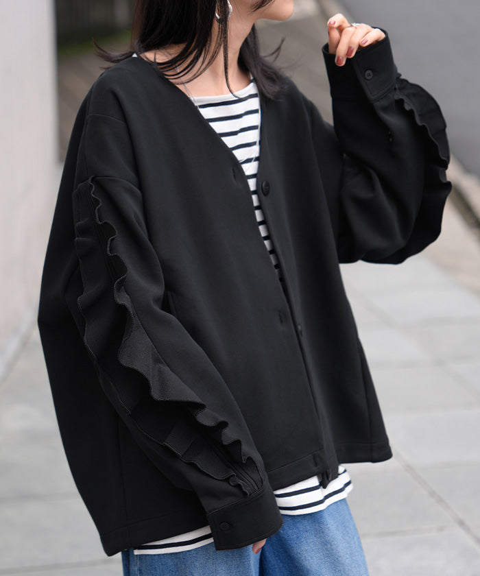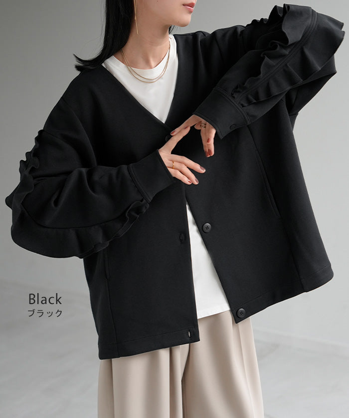 2025AW新作 アウター ジャケット フリル ■11月中旬入荷 ダンボール レディース ロング Vネック ノーカラー 無地 長袖 羽織 ライトアウター チュニック オーバーサイズ シワになりにくい 軽い 暖かい 大きいサイズ 体型カバー きれいめ オフィスカジュアル 黒 ブラック 秋 冬 HUG.U
