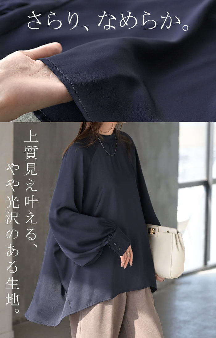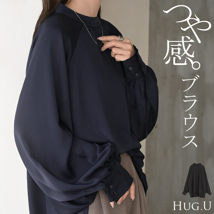 2025AW新作 ブラウス レディース ノーカラー ■12月上旬入荷 トップス バンドカラー シャツ ロング ロングシャツ サテン生地 長袖 無地 きれいめ ゆったり ラグランスリーブ ボリューム袖 ぽわん袖 大きいサイズ 体型カバー フォーマル オフィスカジュアル 黒 ネイビー 秋 冬 HUG.U メール便