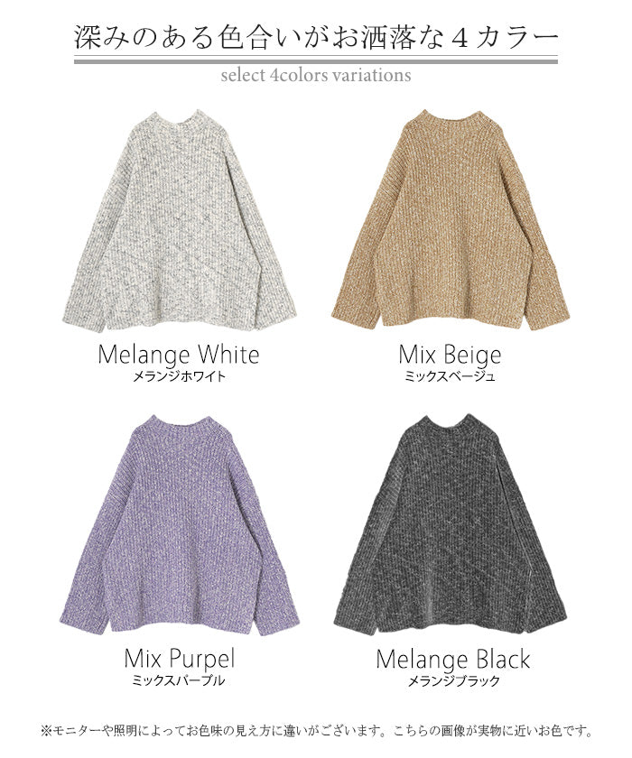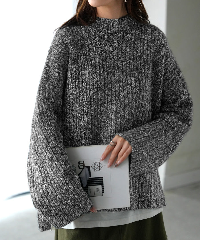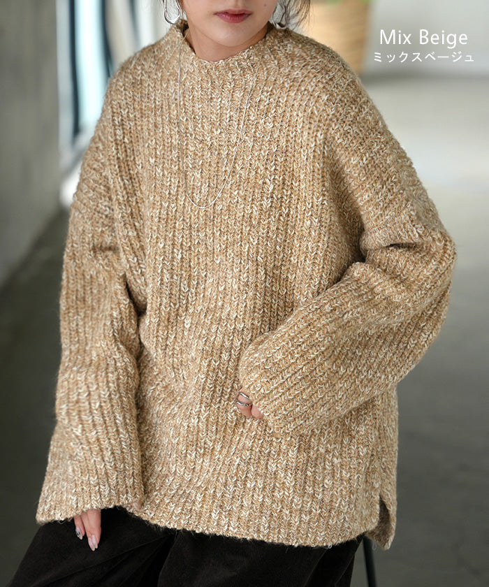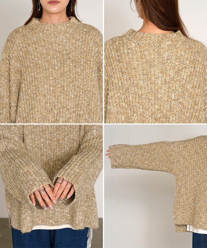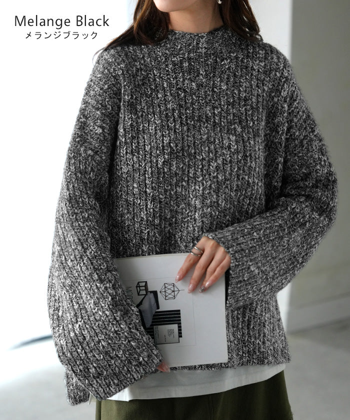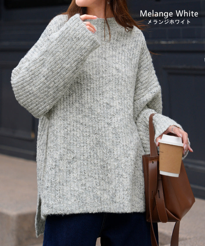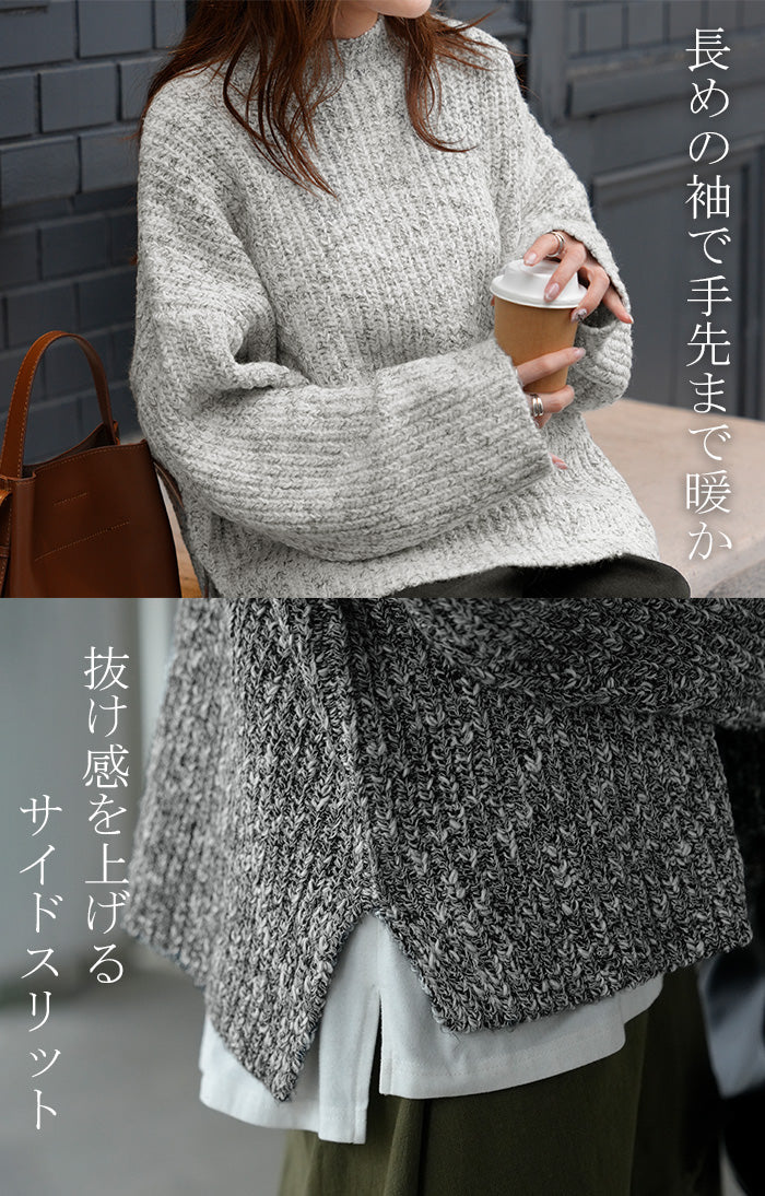 2025AW新作 ニット メランジ ボトルネック レディース トップス セーター リブ オーバー プルオーバー リブ編み ローゲージニット ハイネック スリット チクチクしない ミックス 長袖 長い チュニック ゆったり 体型カバー 大きいサイズ カジュアル 黒 白 秋 冬 HUG.U