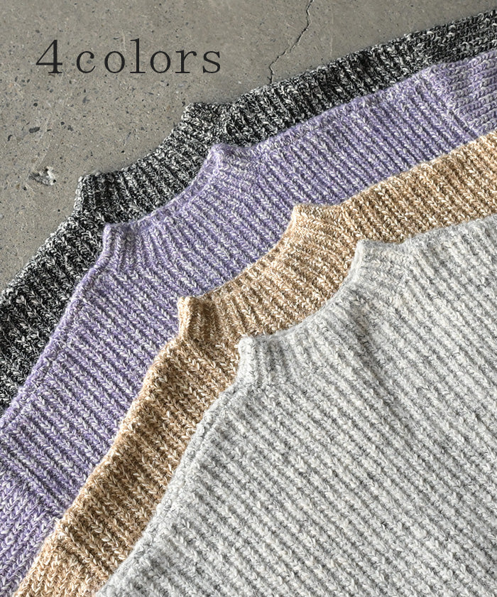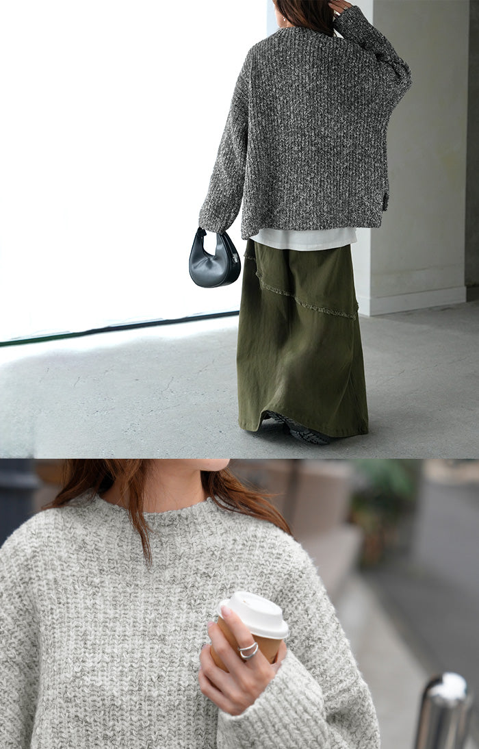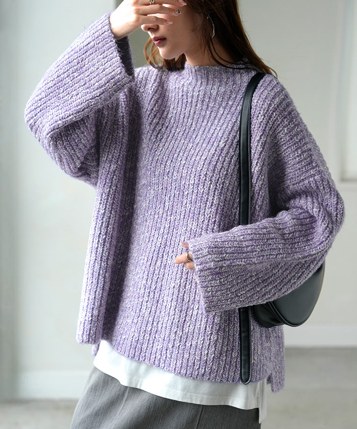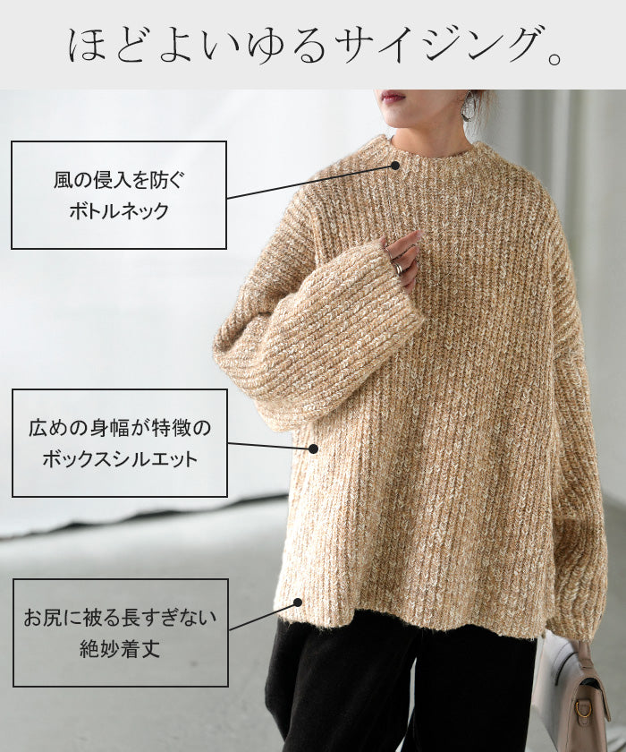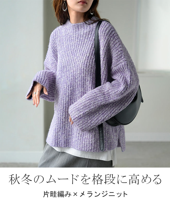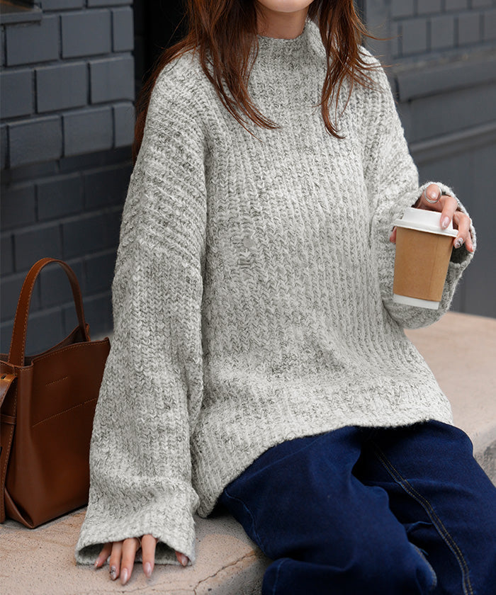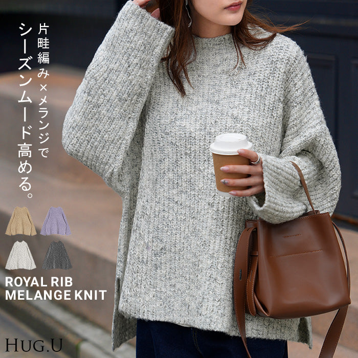 2025AW新作 ニット メランジ ボトルネック レディース トップス セーター リブ オーバー プルオーバー リブ編み ローゲージニット ハイネック スリット チクチクしない ミックス 長袖 長い チュニック ゆったり 体型カバー 大きいサイズ カジュアル 黒 白 秋 冬 HUG.U