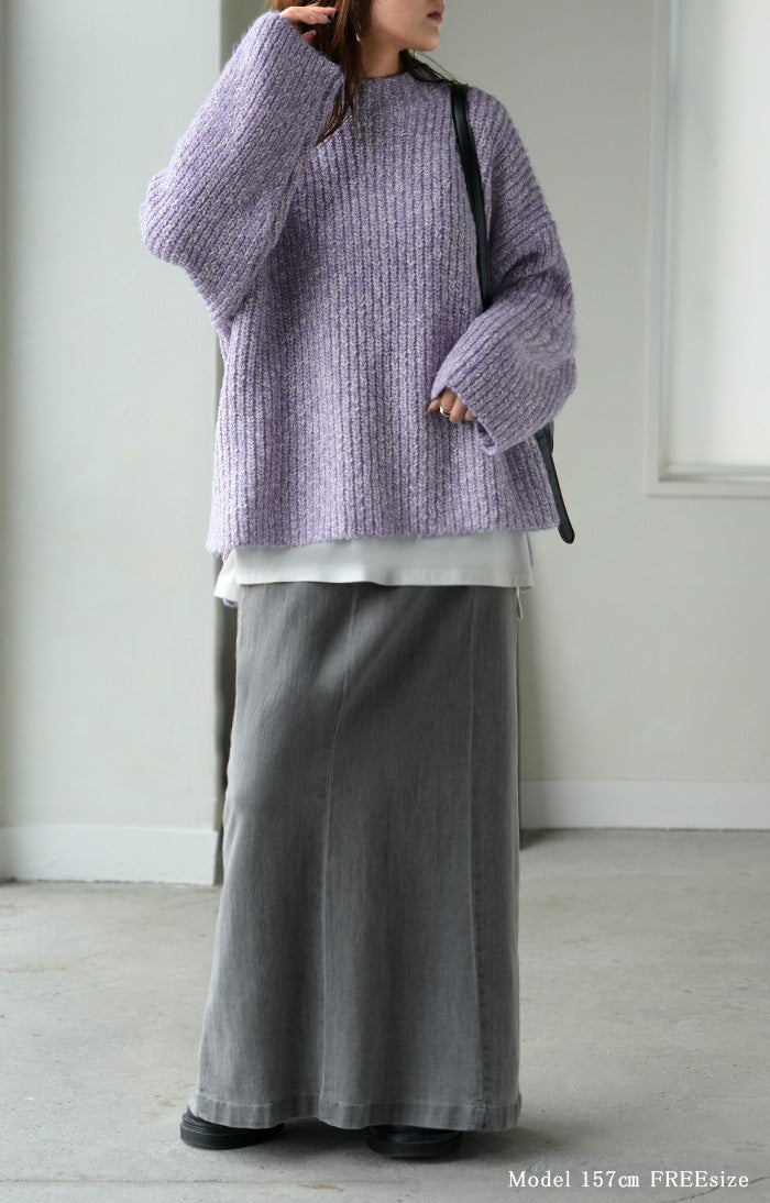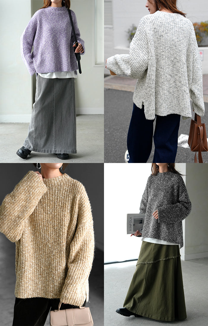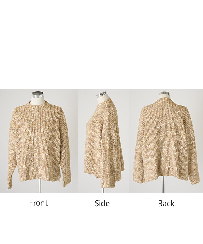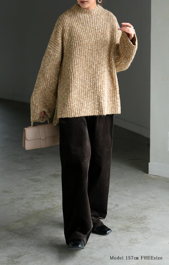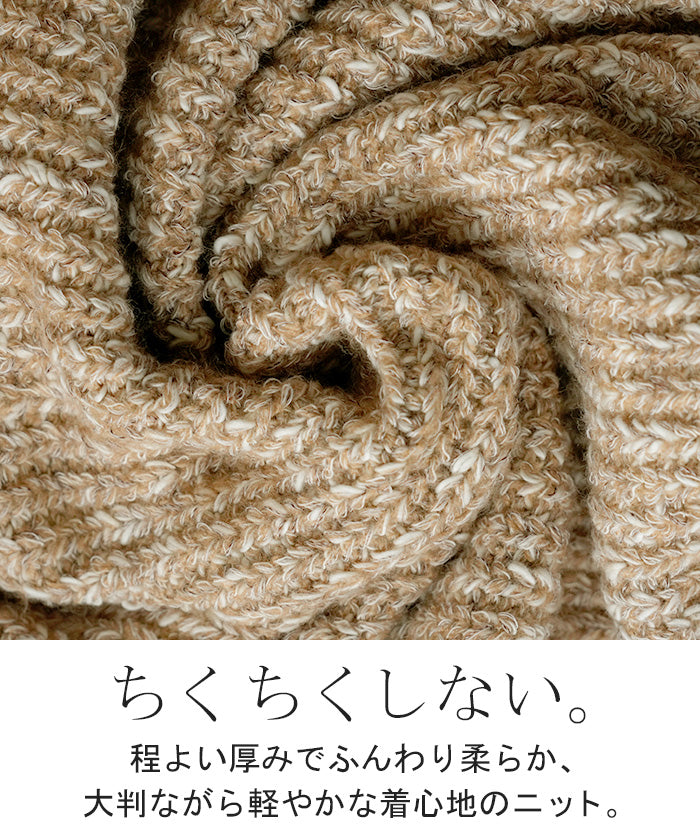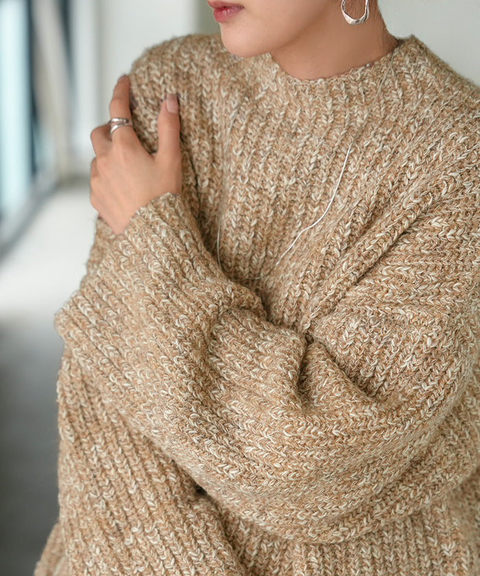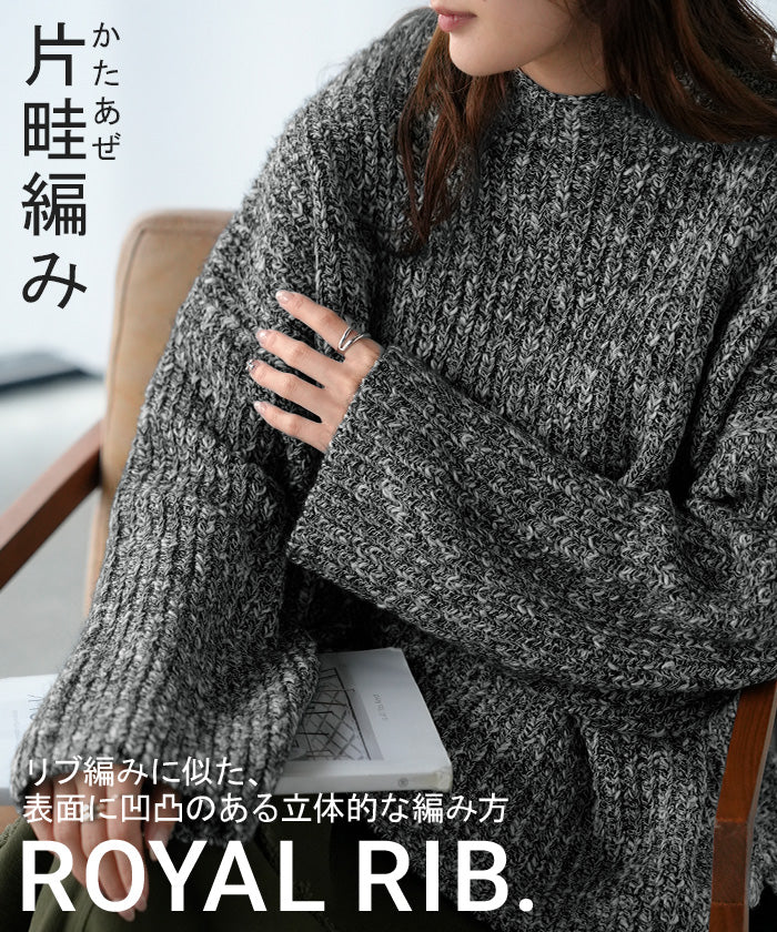 2025AW新作 ニット メランジ ボトルネック レディース トップス セーター リブ オーバー プルオーバー リブ編み ローゲージニット ハイネック スリット チクチクしない ミックス 長袖 長い チュニック ゆったり 体型カバー 大きいサイズ カジュアル 黒 白 秋 冬 HUG.U