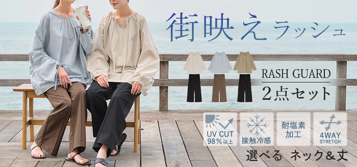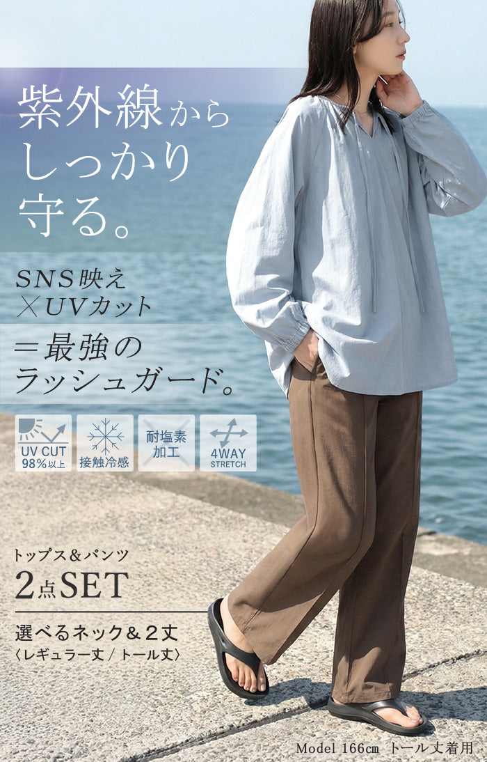【早割10%OFF】2026SS新作 ラッシュガード 上下 2点セット UVカット 水陸両用 レディース 長袖 トップス ロング パンツ キーネック クルーネック 紫外線対策 耐塩素加工 接触冷感 吸水 速乾 長い 10分丈 ストレッチ プール 海 海水浴 スポーツ 黒 ブルー 春 冬 HUG.U 春 夏 HUG.U
