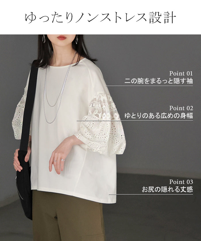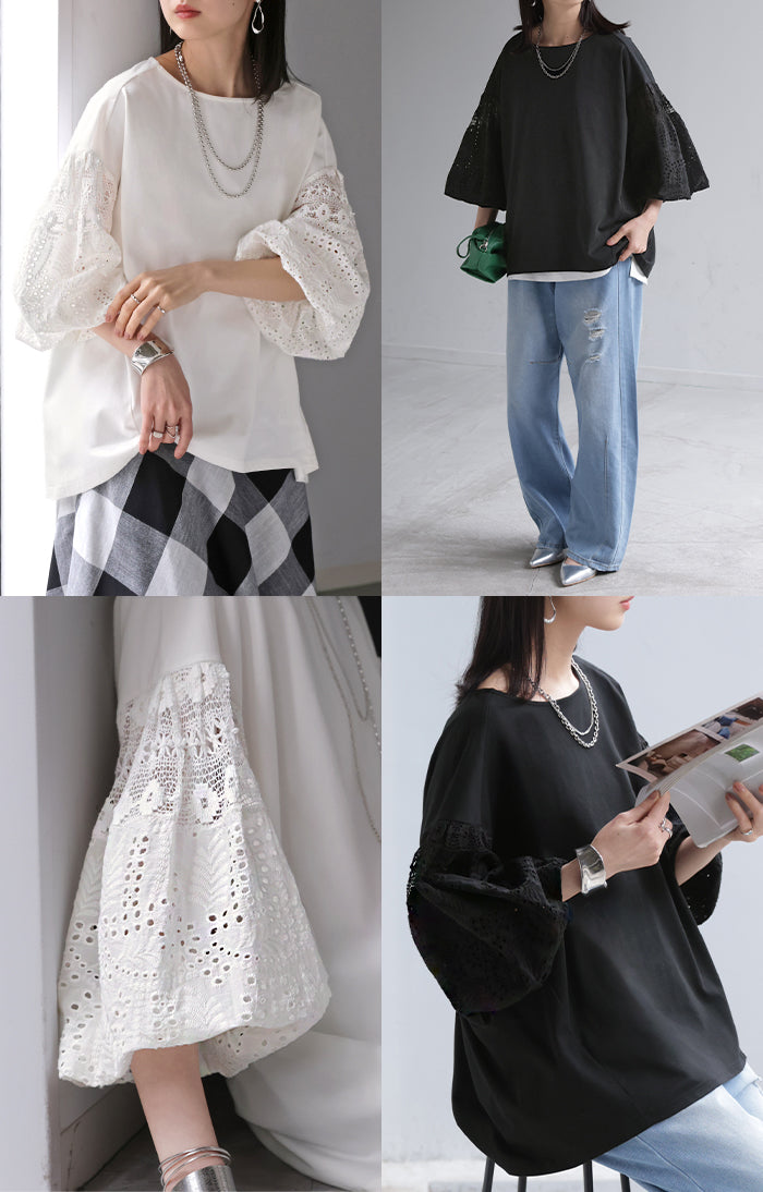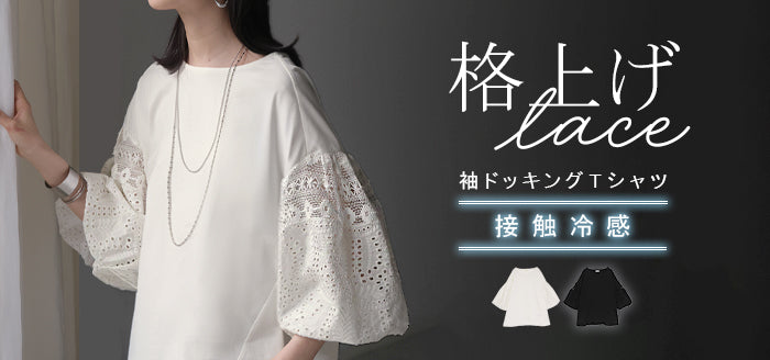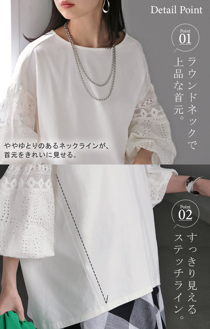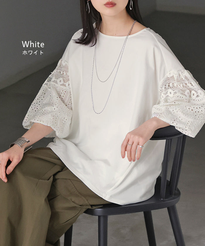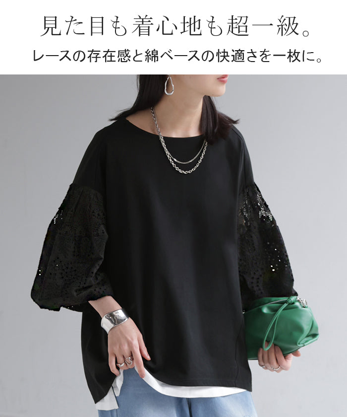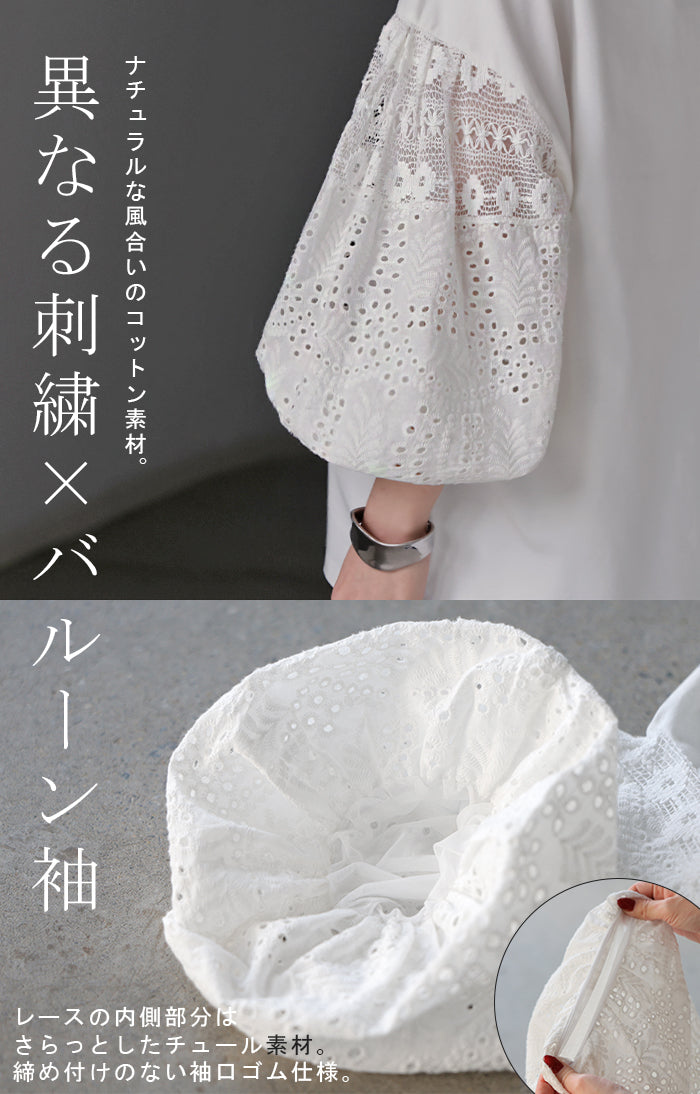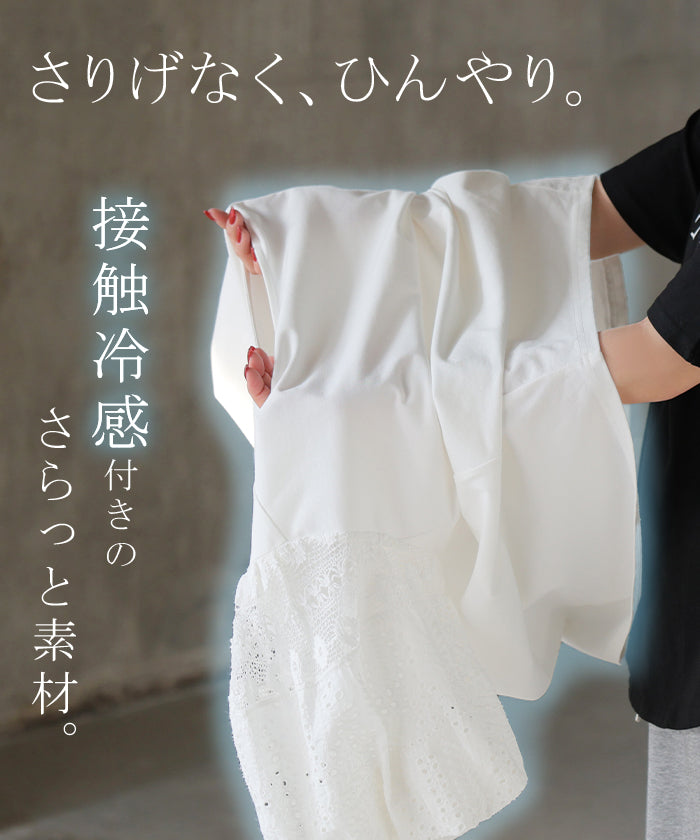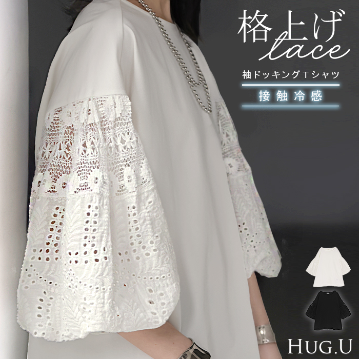 2026SS新作 Tシャツ 接触冷感 レース ドッキング レディース トップス ロング カットソー 異素材 ティーシャツ ラウンドネック 半袖 バルーン 長い 透けにくい 綿 涼しい ゆったり 無地 体型カバー 二の腕カバー お尻が隠れる 大きいサイズ おしゃれ 白 黒 春 夏 HUG.U