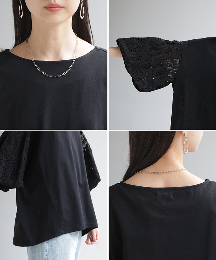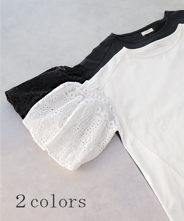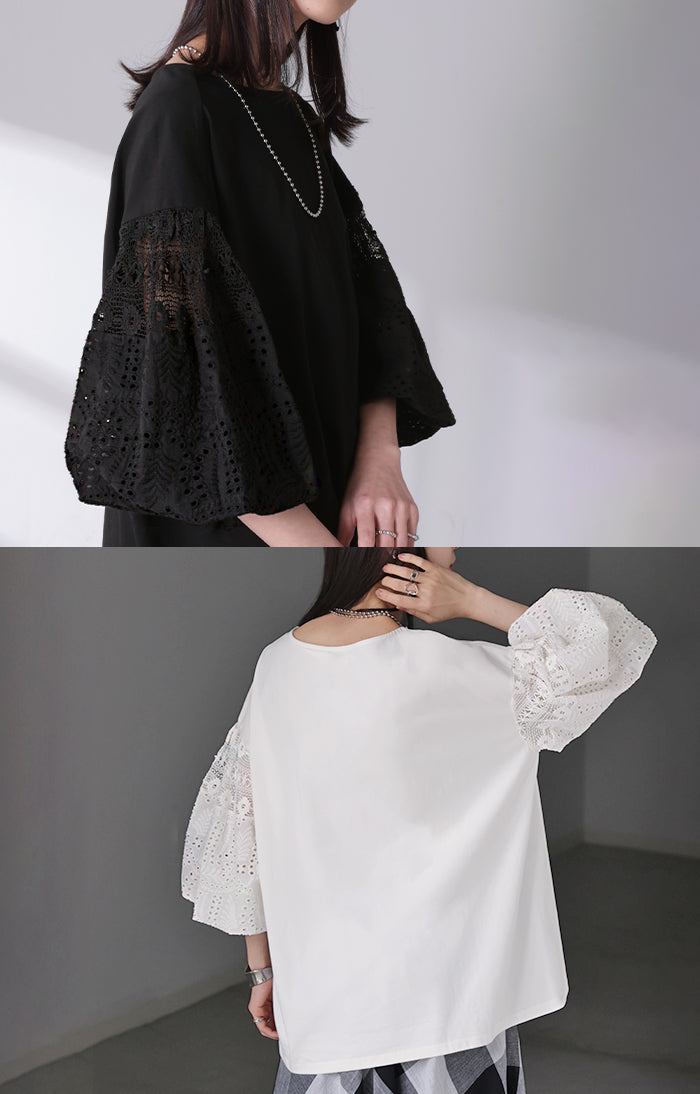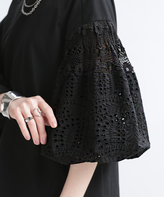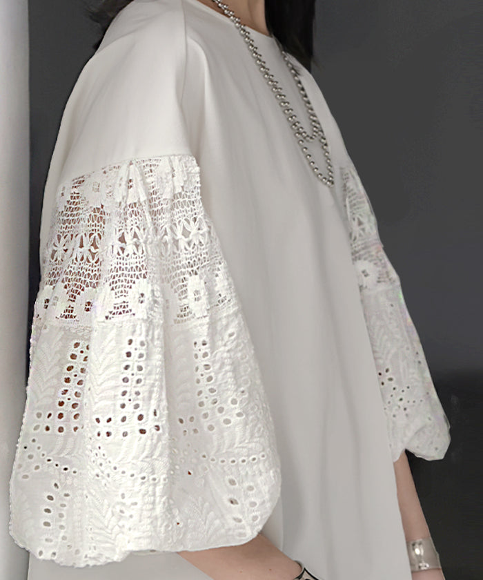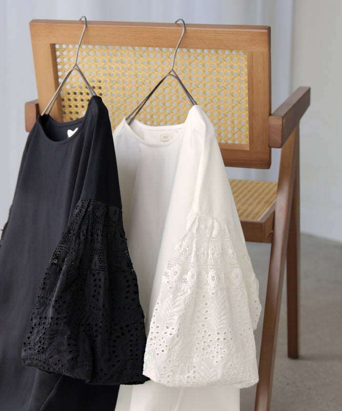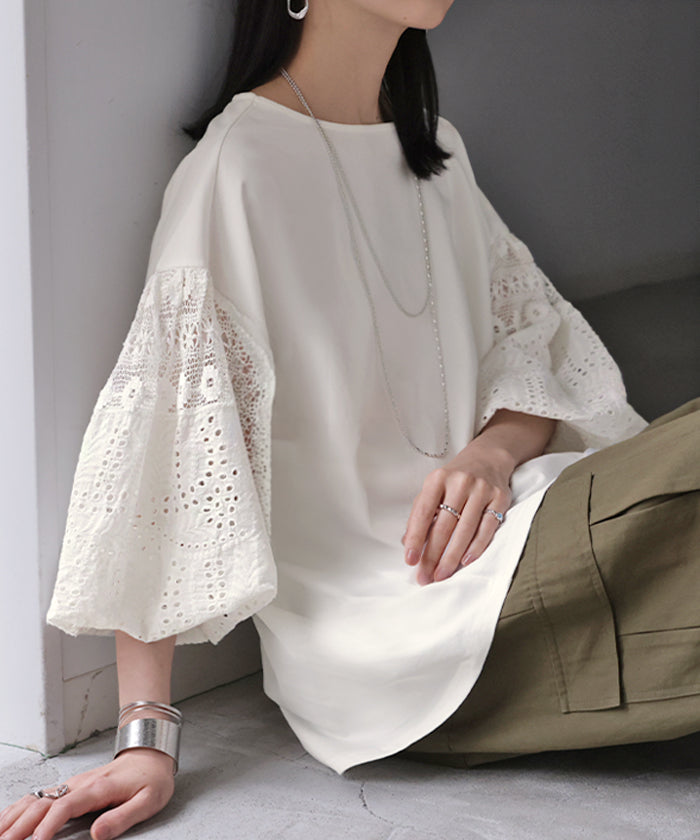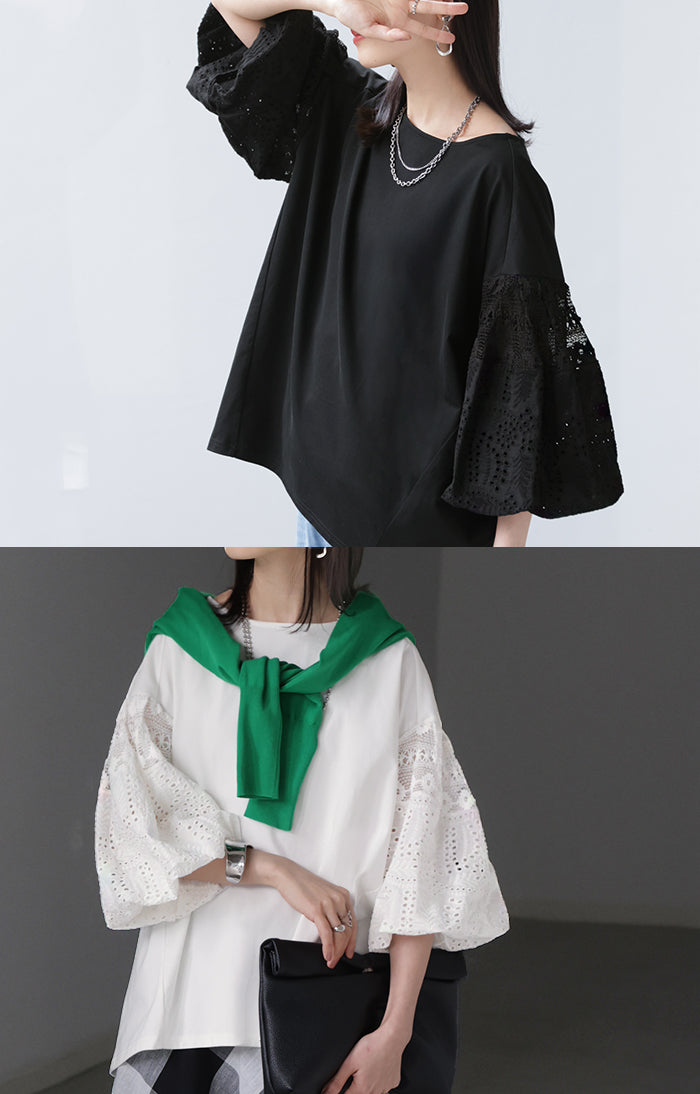 2026SS新作 Tシャツ 接触冷感 レース ドッキング レディース トップス ロング カットソー 異素材 ティーシャツ ラウンドネック 半袖 バルーン 長い 透けにくい 綿 涼しい ゆったり 無地 体型カバー 二の腕カバー お尻が隠れる 大きいサイズ おしゃれ 白 黒 春 夏 HUG.U