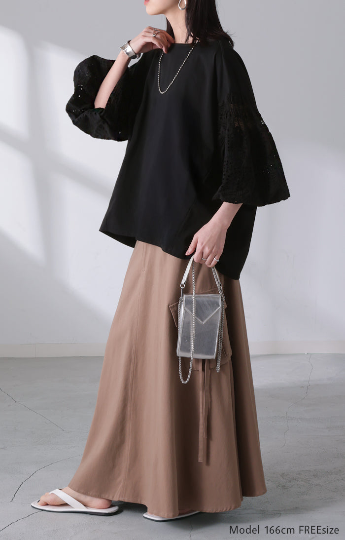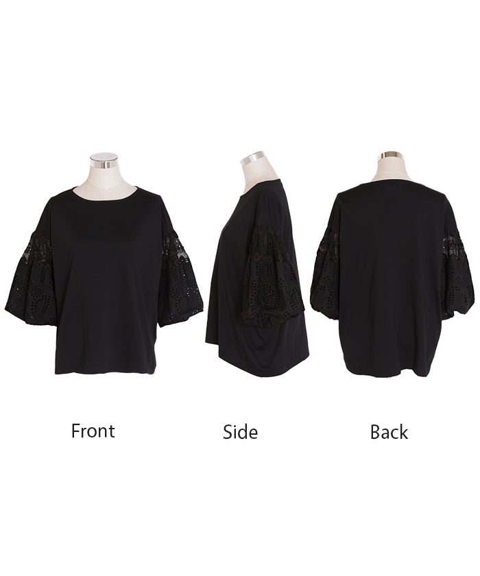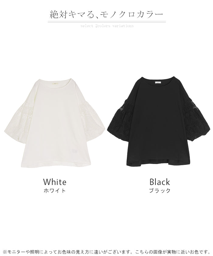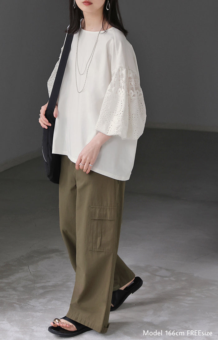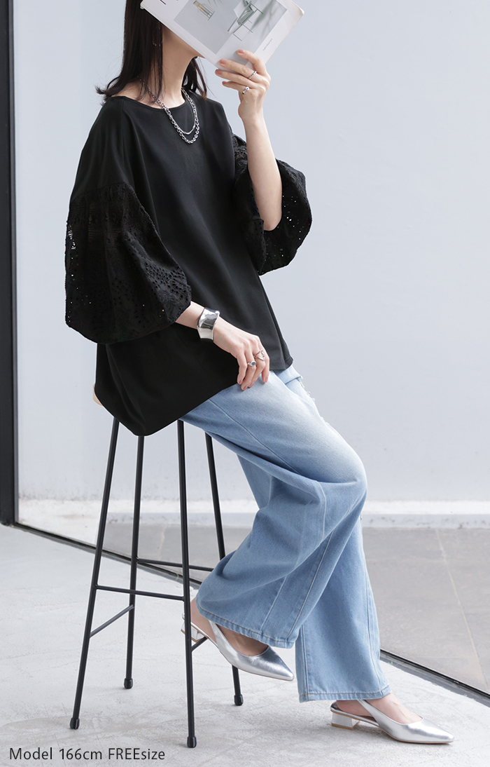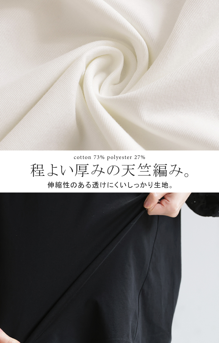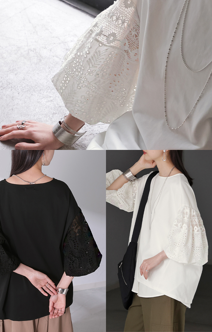 2026SS新作 Tシャツ 接触冷感 レース ドッキング レディース トップス ロング カットソー 異素材 ティーシャツ ラウンドネック 半袖 バルーン 長い 透けにくい 綿 涼しい ゆったり 無地 体型カバー 二の腕カバー お尻が隠れる 大きいサイズ おしゃれ 白 黒 春 夏 HUG.U