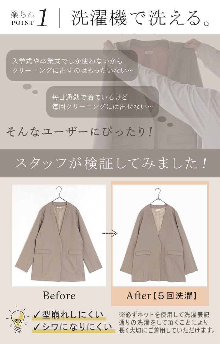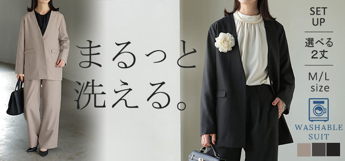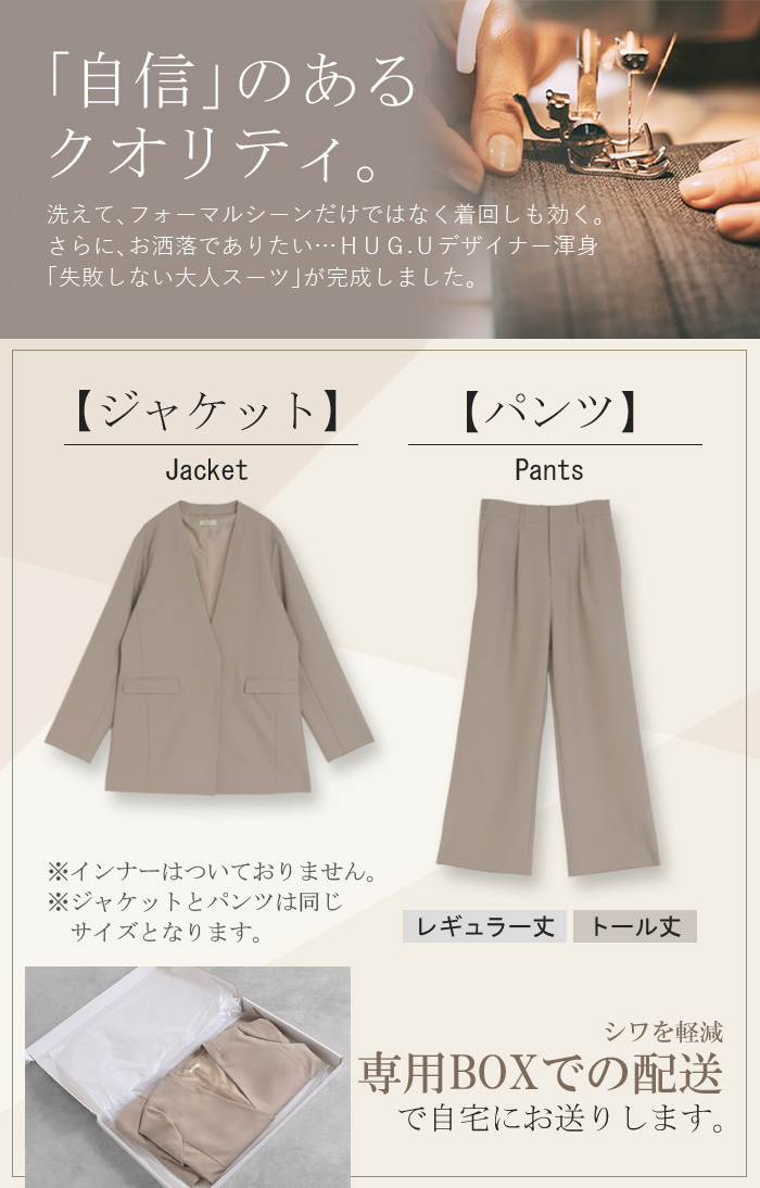 {"id":48075741266072,"title":"ベージュ \/ M(レギュラー丈)","option1":"ベージュ","option2":"M(レギュラー丈)","option3":null,"sku":"f992BGRM","requires_shipping":true,"taxable":true,"featured_image":{"id":52058082771096,"product_id":8990862573720,"position":29,"created_at":"2026-01-29T14:41:50+09:00","updated_at":"2026-01-30T17:14:46+09:00","alt":null,"width":700,"height":840,"src":"\/\/hug-u.2plus8.co.jp\/cdn\/shop\/files\/f992-bg.jpg?v=1769760886","variant_ids":[48075741266072,48075741298840,48075741331608,48075741364376]},"available":true,"name":"【7,000円OFF】2026SS新作 「洗濯機で洗える」 フォーマル 2点セット パンツ ジャケット レディース パンツスーツ スーツ セットアップ ノーカラー 入学式 卒業式 お宮参り セレモニースーツ レディーススーツ 母親 ママ フォーマルスーツ オフィスカジュアル 黒 グレー 春 夏 HUG.U - ベージュ \/ M(レギュラー丈)","public_title":"ベージュ \/ M(レギュラー丈)","options":["ベージュ","M(レギュラー丈)"],"price":1300000,"weight":0,"compare_at_price":2000000,"inventory_management":"shopify","barcode":null,"featured_media":{"alt":null,"id":43690145710232,"position":29,"preview_image":{"aspect_ratio":0.833,"height":840,"width":700,"src":"\/\/hug-u.2plus8.co.jp\/cdn\/shop\/files\/f992-bg.jpg?v=1769760886"}},"requires_selling_plan":false,"selling_plan_allocations":[]}