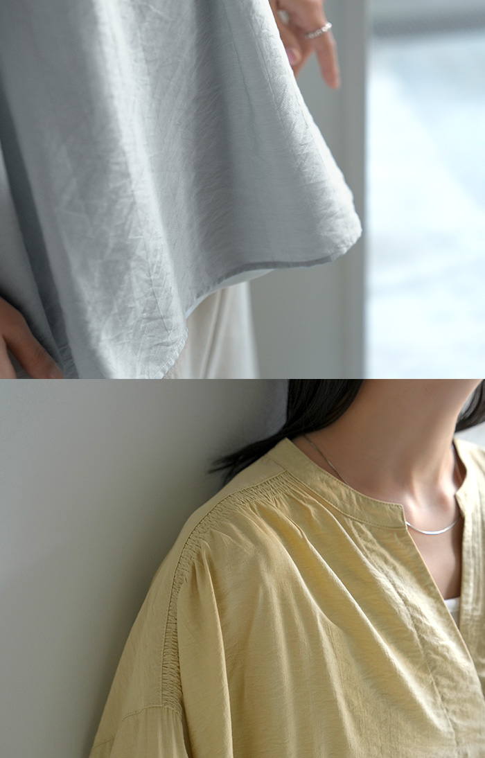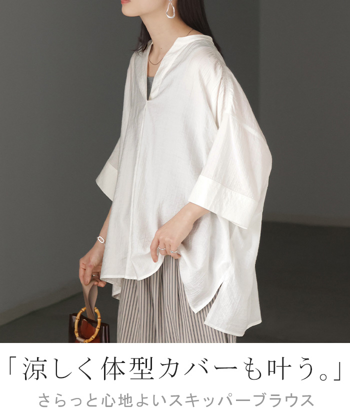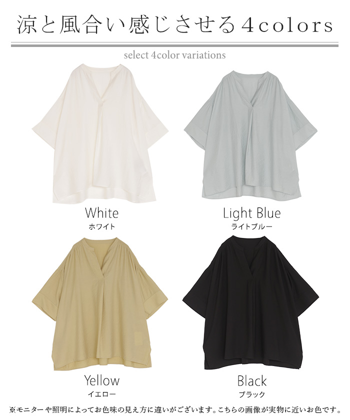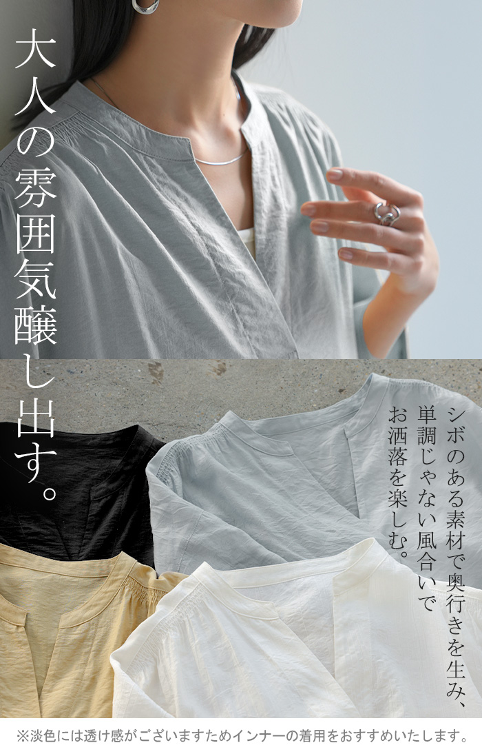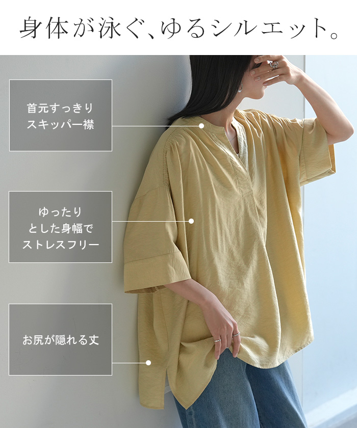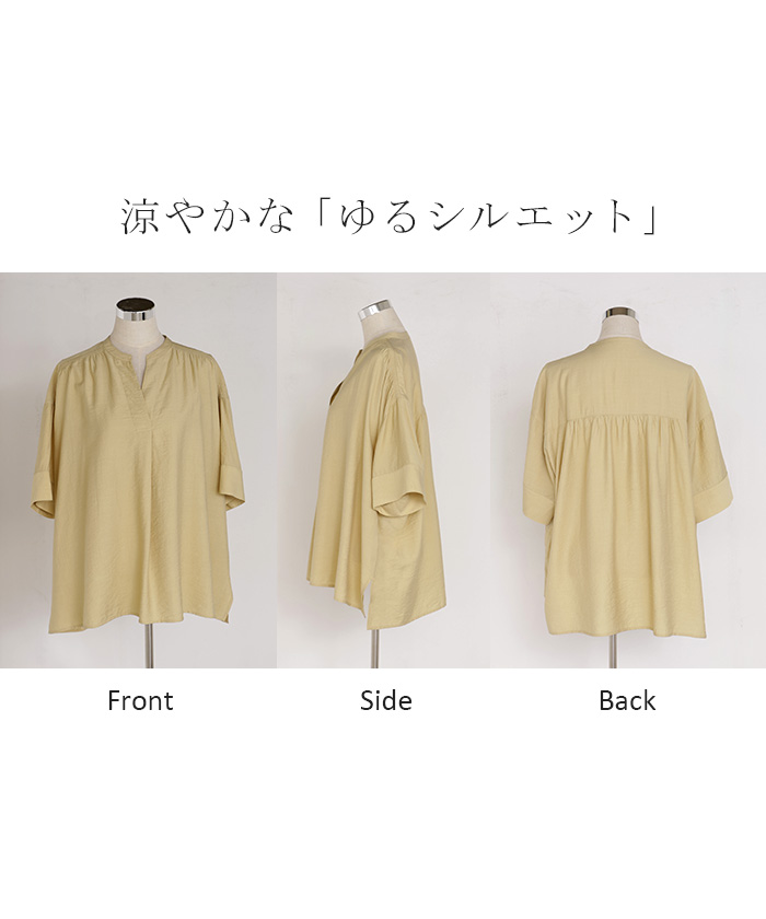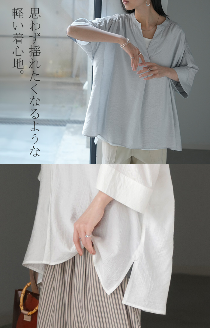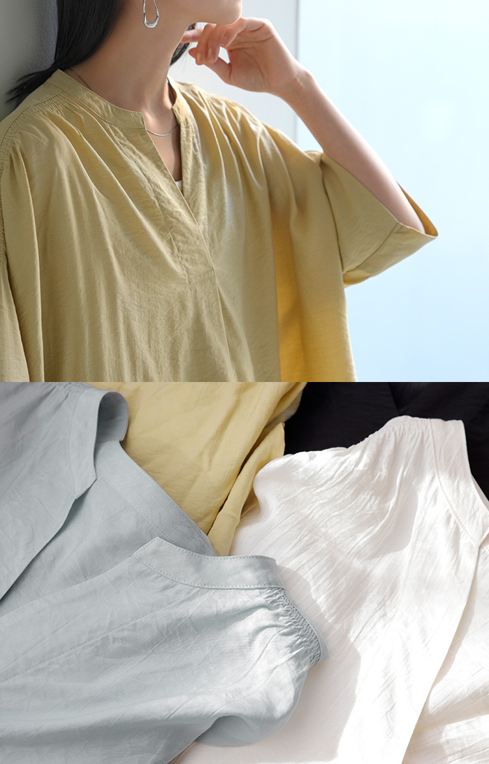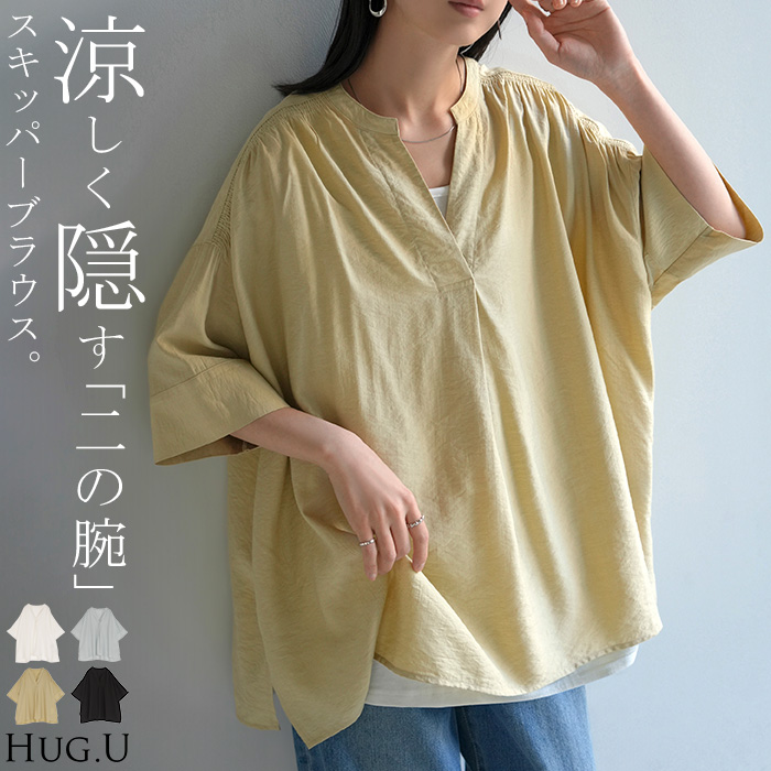 2026SS新作 シャツ レディース ノーカラー トップス キーネック ブラウス ロング ロングシャツ チュニック 半袖 無地 バンドカラー ドルマンスリーブ 涼しい 二の腕カバー きれいめ ゆったり 大きいサイズ 体型カバー お尻が隠れる 薄手 ブルー 黒 HUG.U 春 夏 HUG.U メール便