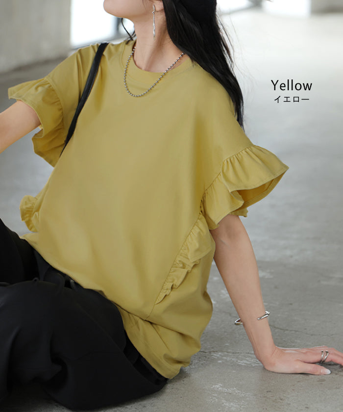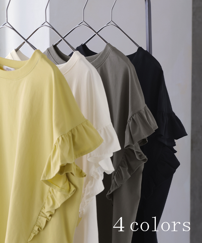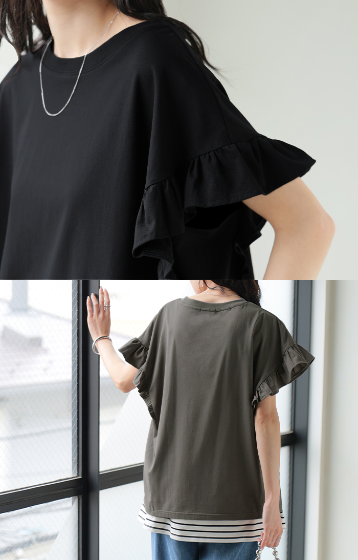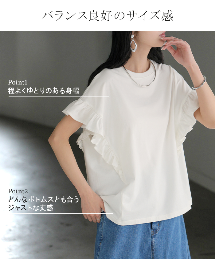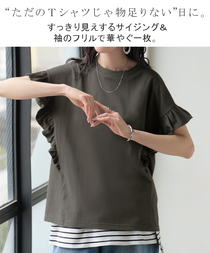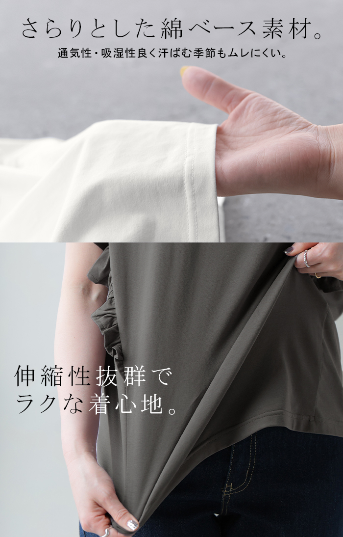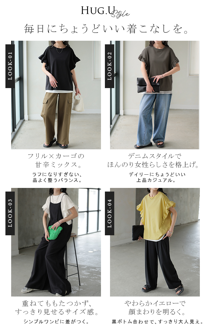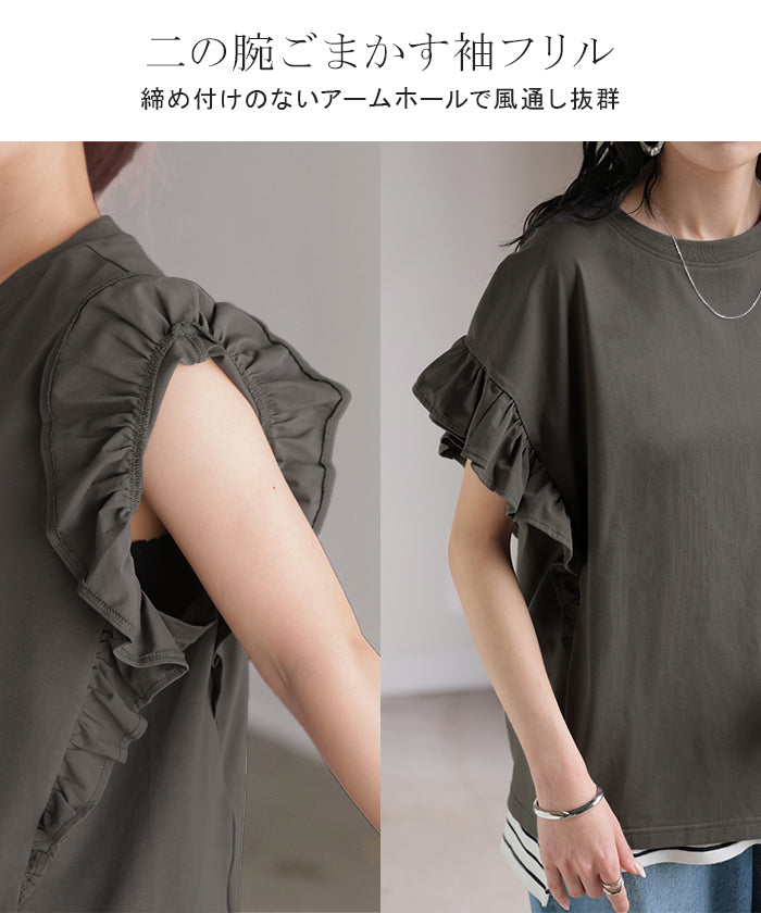 2026SS新作 Tシャツ フリル 袖 レディース ■4月上旬入荷 トップス ジャスト丈 フリル袖 フレア ティーシャツ クルーネック 長い 半袖 ストレッチ 軽い ゆったり 無地 シンプル 通気性 吸湿性 蒸れにくい 体型カバー 大きいサイズ ロング おしゃれ 白 黒 春 夏 HUG.U