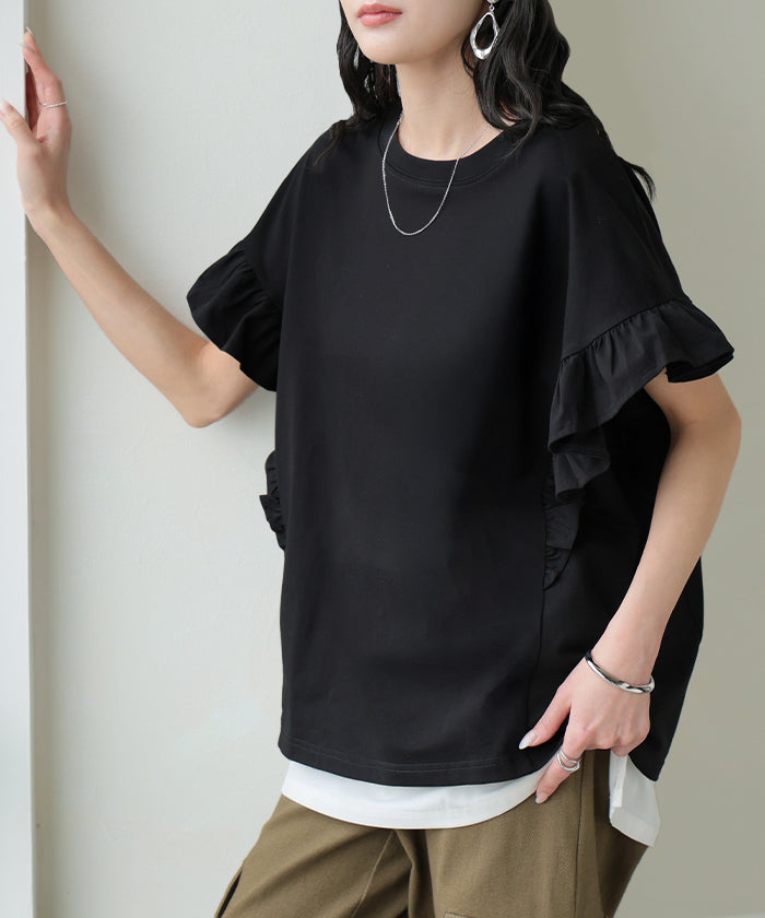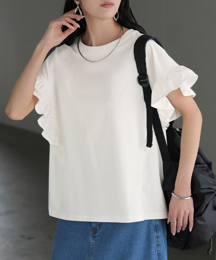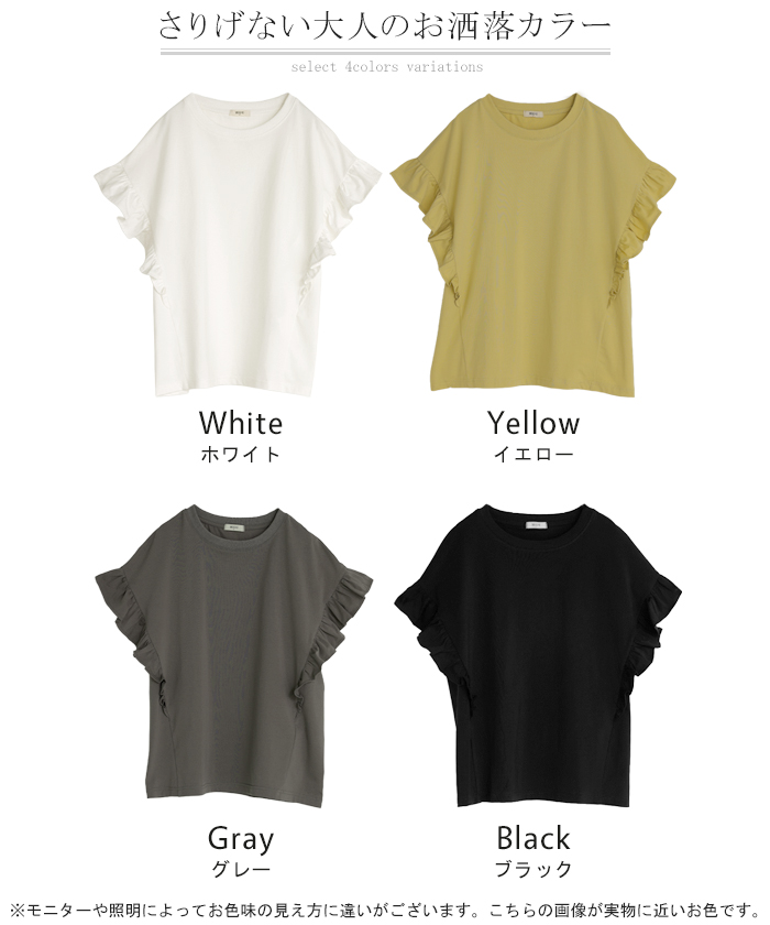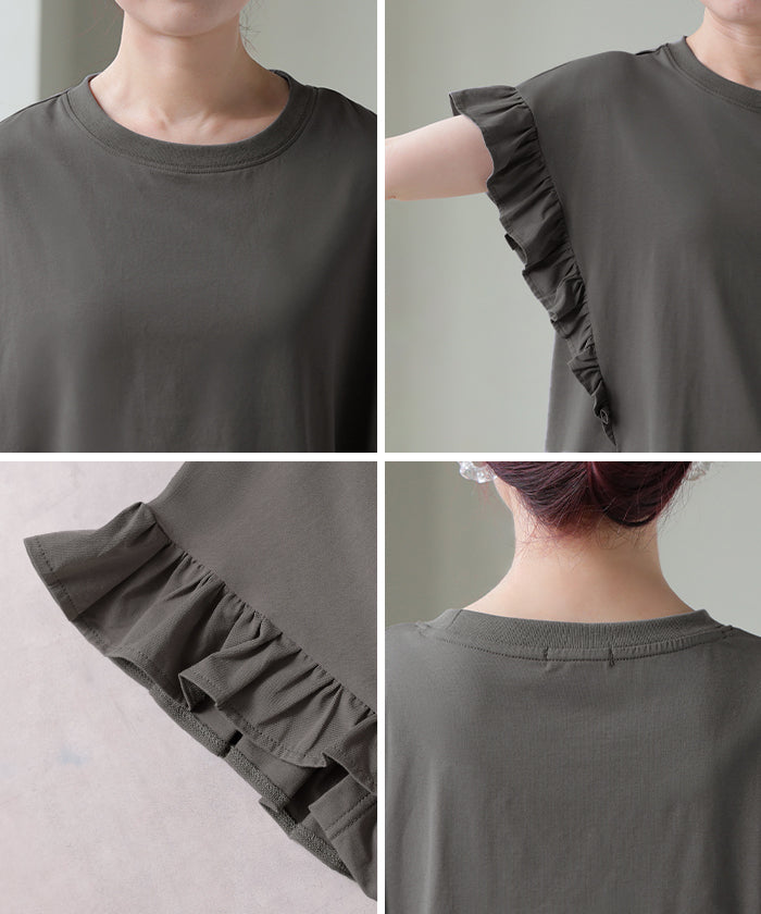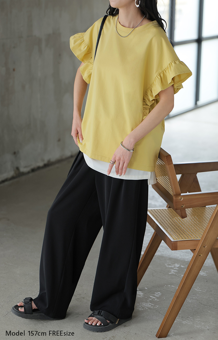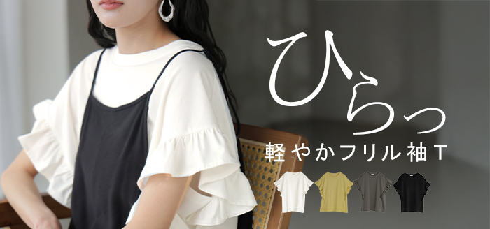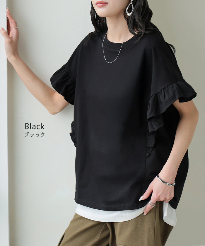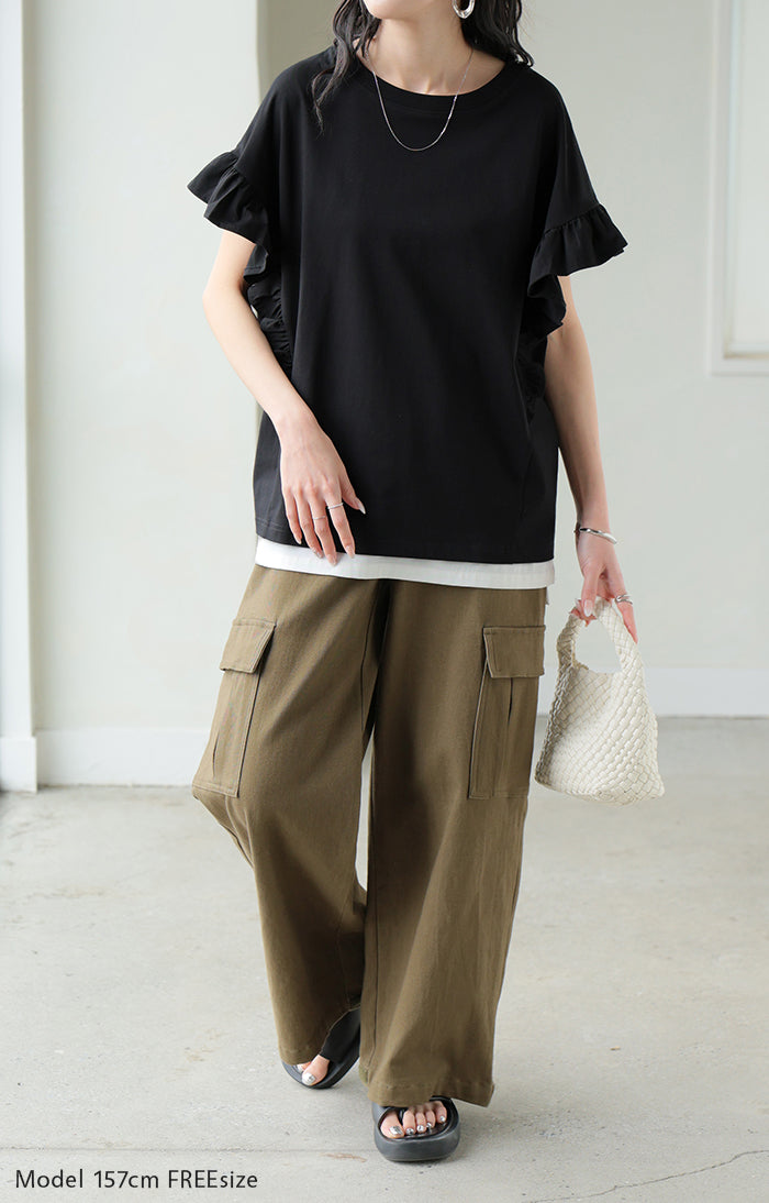 2026SS新作 Tシャツ フリル 袖 レディース ■4月上旬入荷 トップス ジャスト丈 フリル袖 フレア ティーシャツ クルーネック 長い 半袖 ストレッチ 軽い ゆったり 無地 シンプル 通気性 吸湿性 蒸れにくい 体型カバー 大きいサイズ ロング おしゃれ 白 黒 春 夏 HUG.U