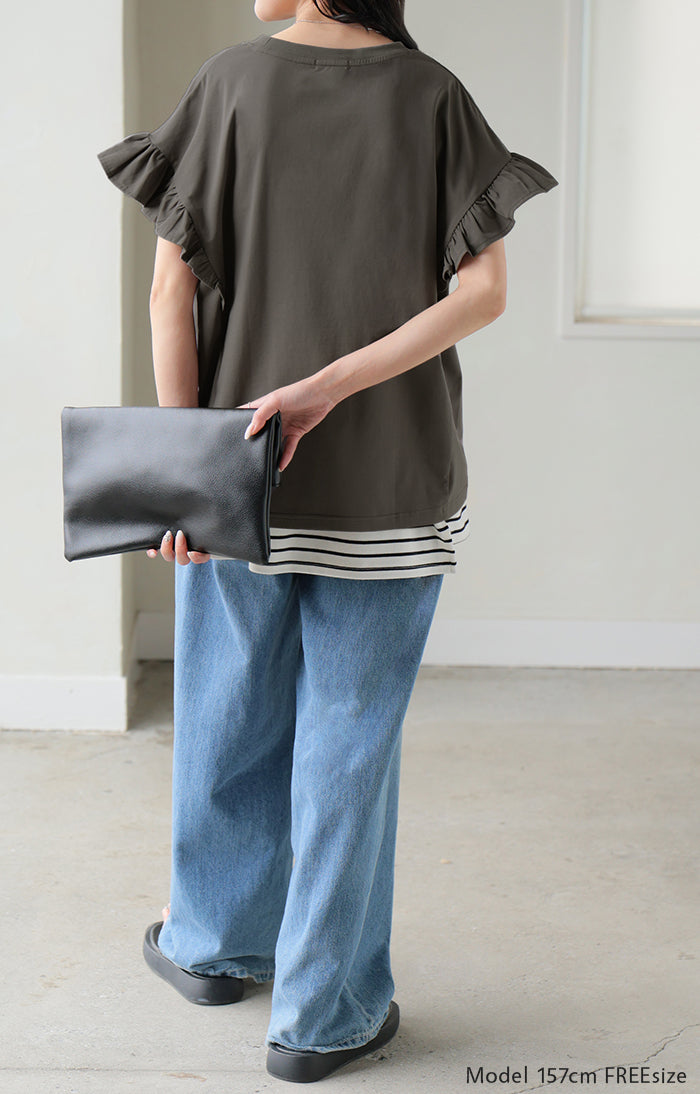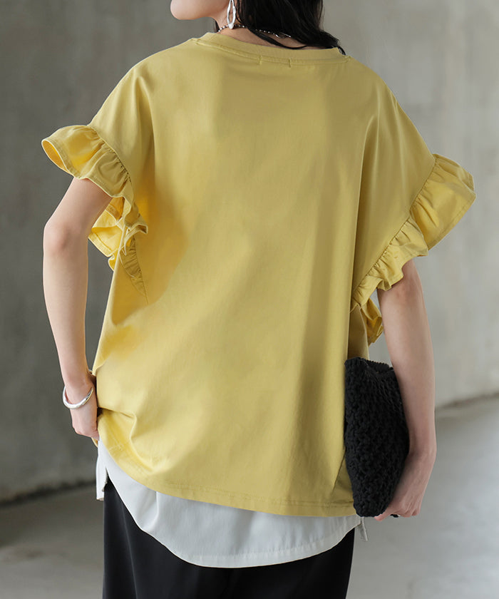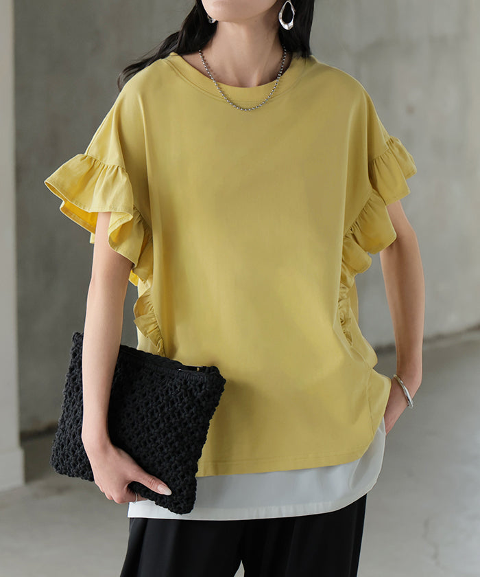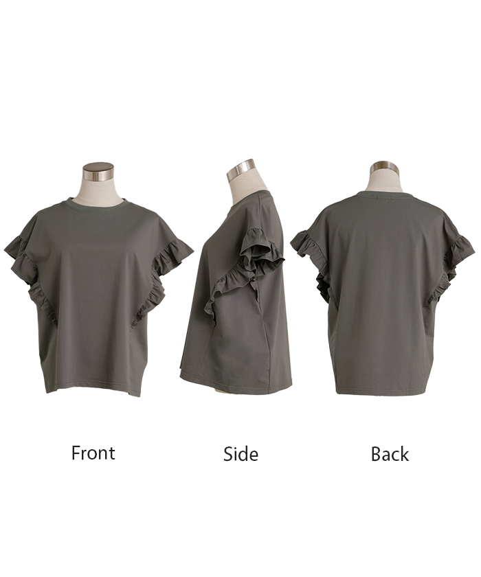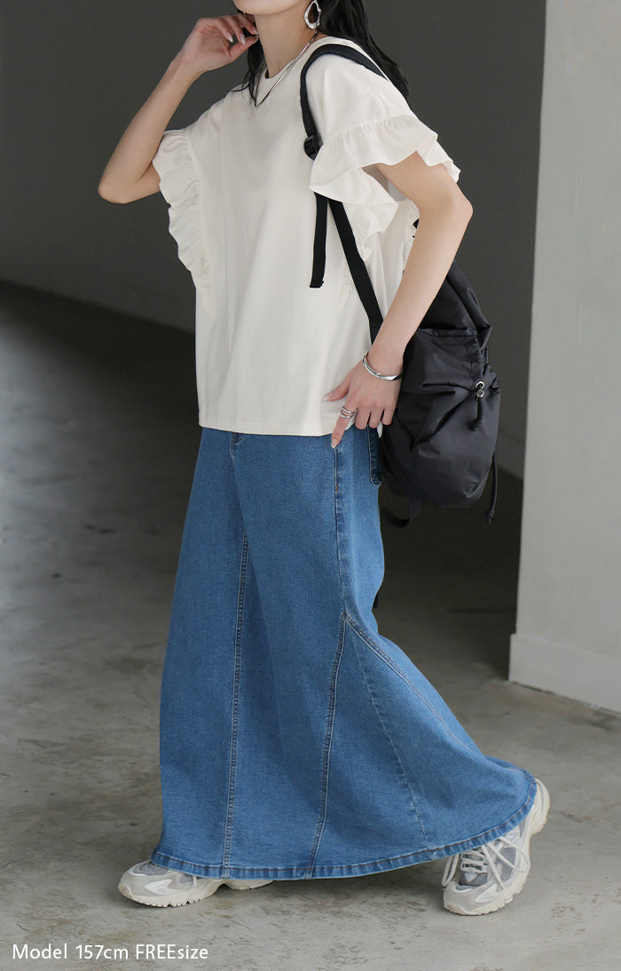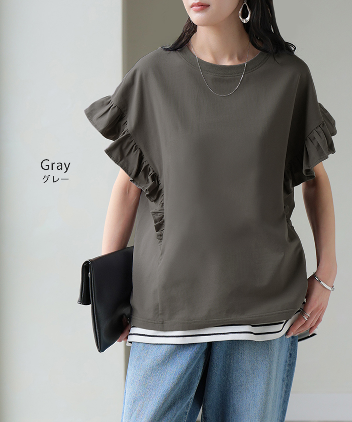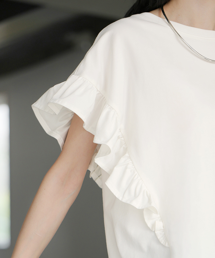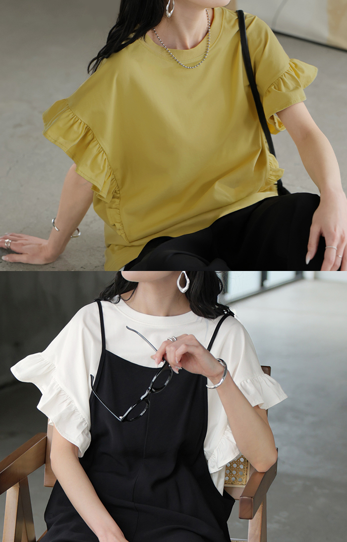 2026SS新作 Tシャツ フリル 袖 レディース ■4月上旬入荷 トップス ジャスト丈 フリル袖 フレア ティーシャツ クルーネック 長い 半袖 ストレッチ 軽い ゆったり 無地 シンプル 通気性 吸湿性 蒸れにくい 体型カバー 大きいサイズ ロング おしゃれ 白 黒 春 夏 HUG.U