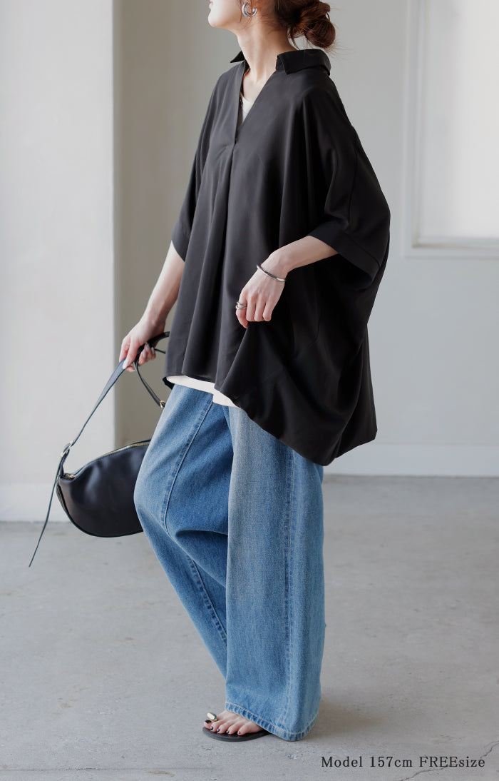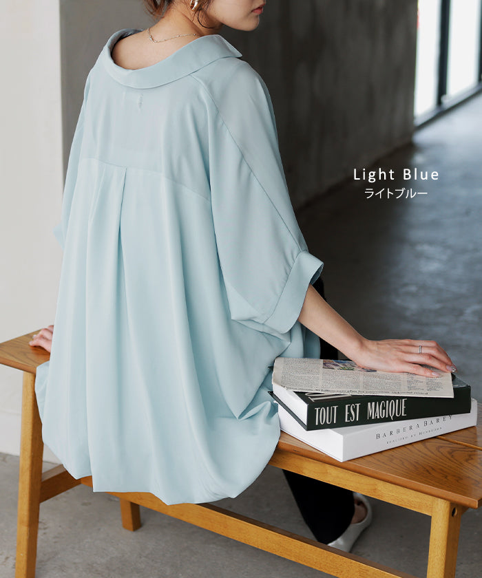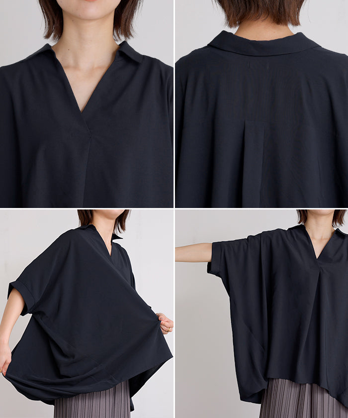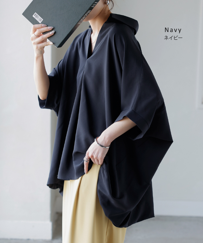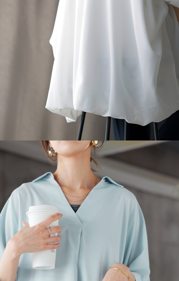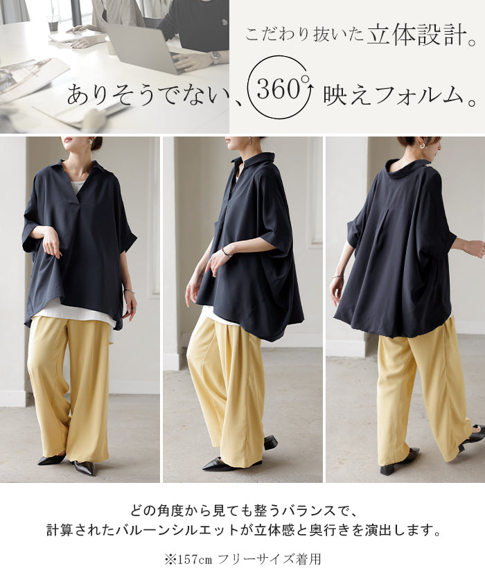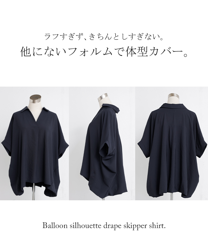 【早割10%OFF】2026SS新作 シャツ スキッパーシャツ ブラウス レディース トップス 半袖 Vネック 深Vネック 五分袖 襟付き バルーン ノンアイロン 体型カバー 大きいサイズ 着痩せ お尻が隠れる シワになりにくい オフィス きれいめ カジュアル 春 夏 ネイビー ブラック HUG.U