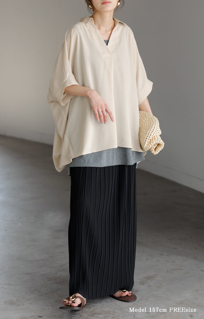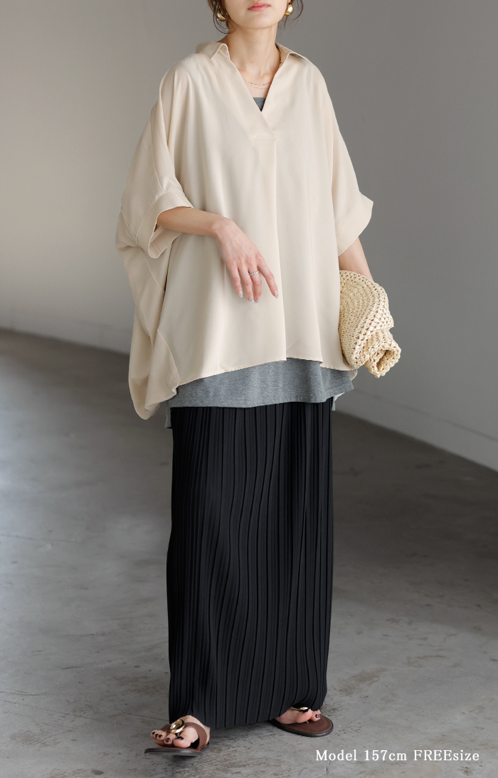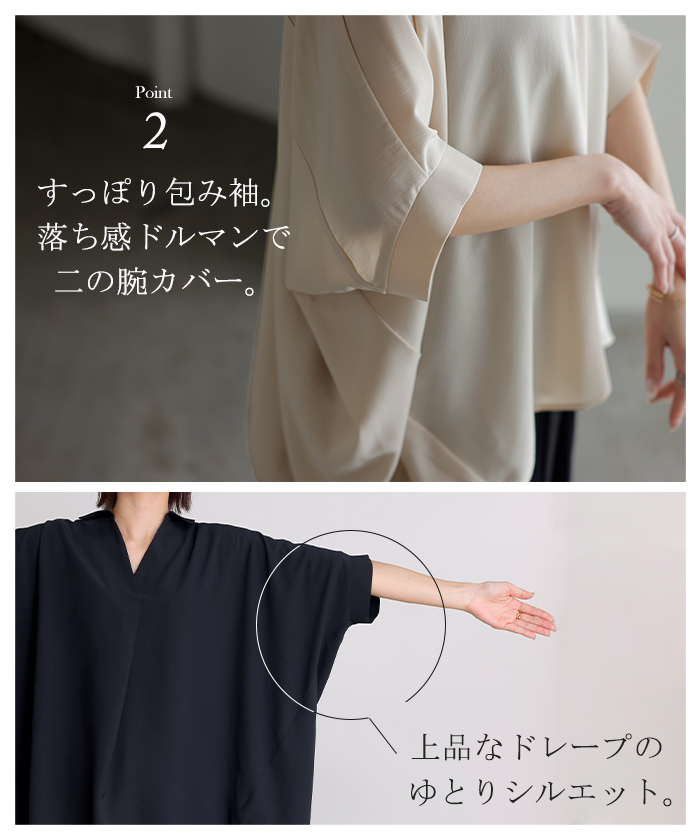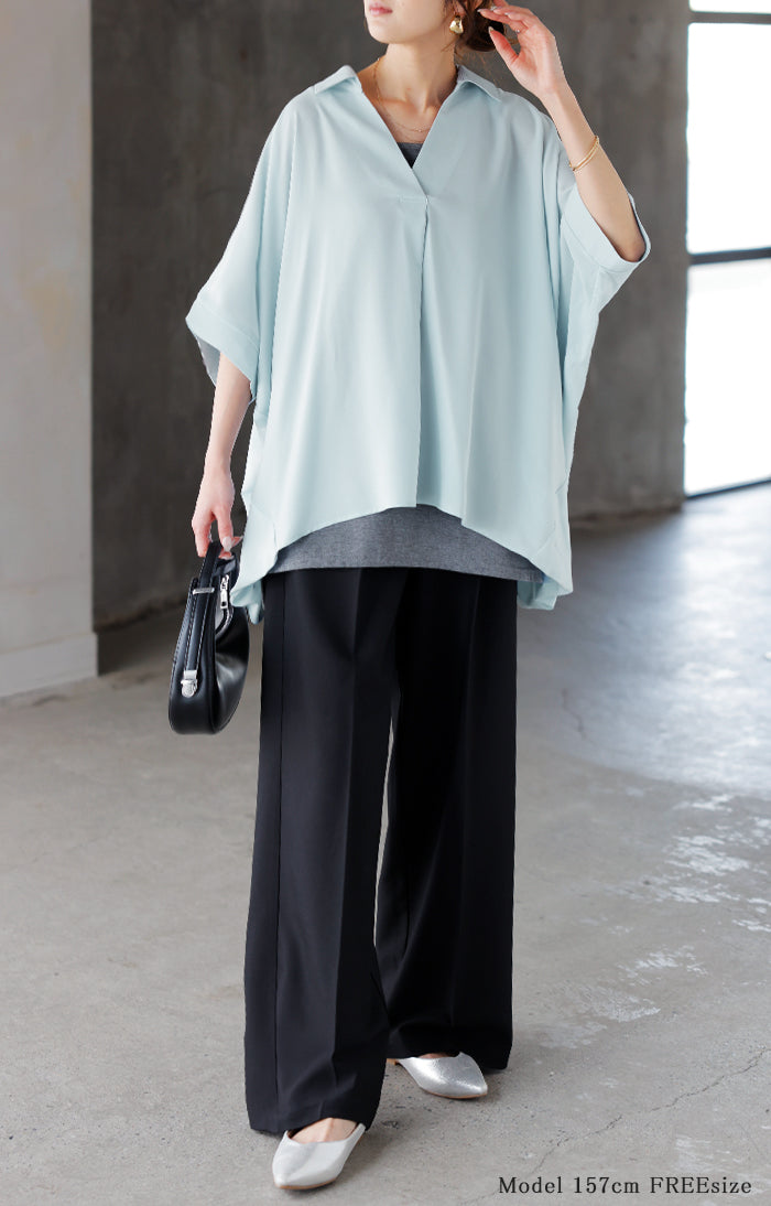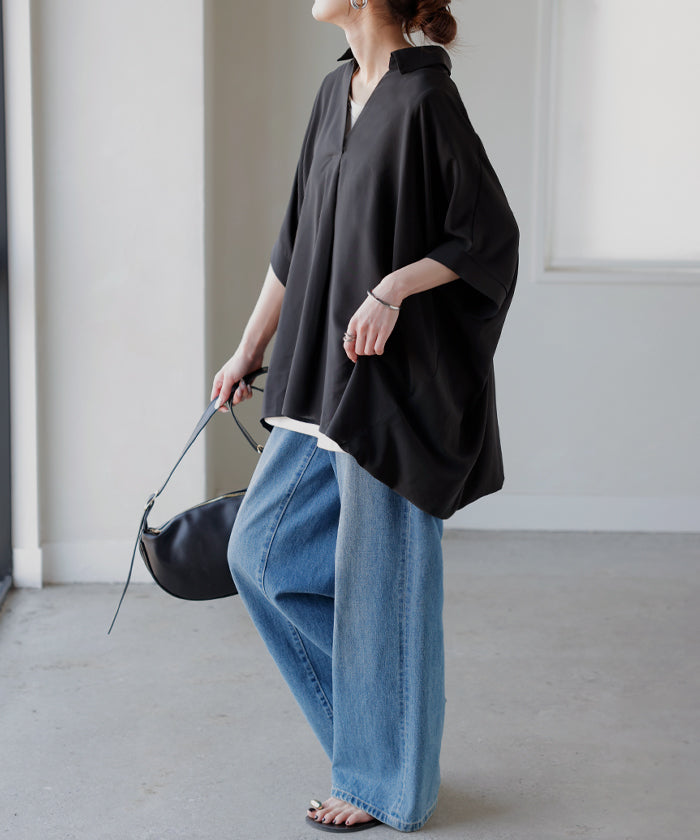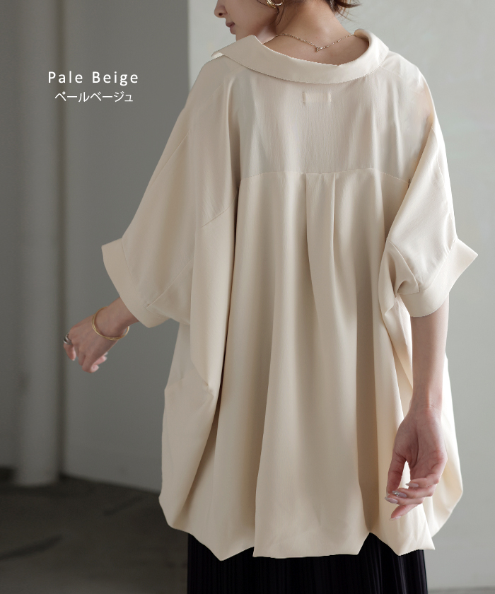 【早割10%OFF】2026SS新作 シャツ スキッパーシャツ ブラウス レディース トップス 半袖 Vネック 深Vネック 五分袖 襟付き バルーン ノンアイロン 体型カバー 大きいサイズ 着痩せ お尻が隠れる シワになりにくい オフィス きれいめ カジュアル 春 夏 ネイビー ブラック HUG.U