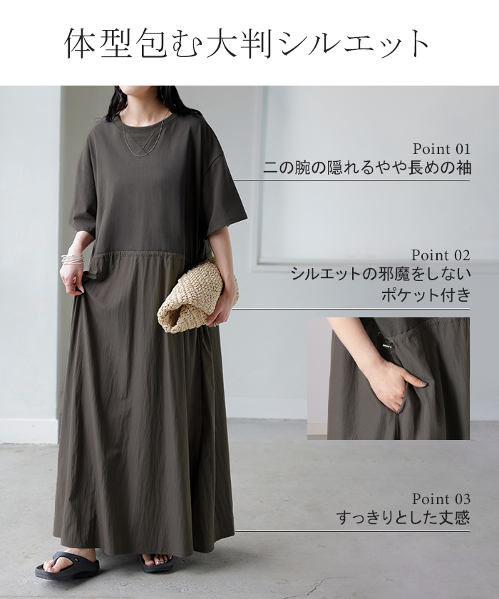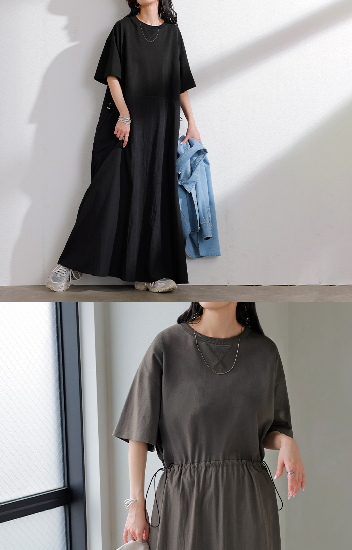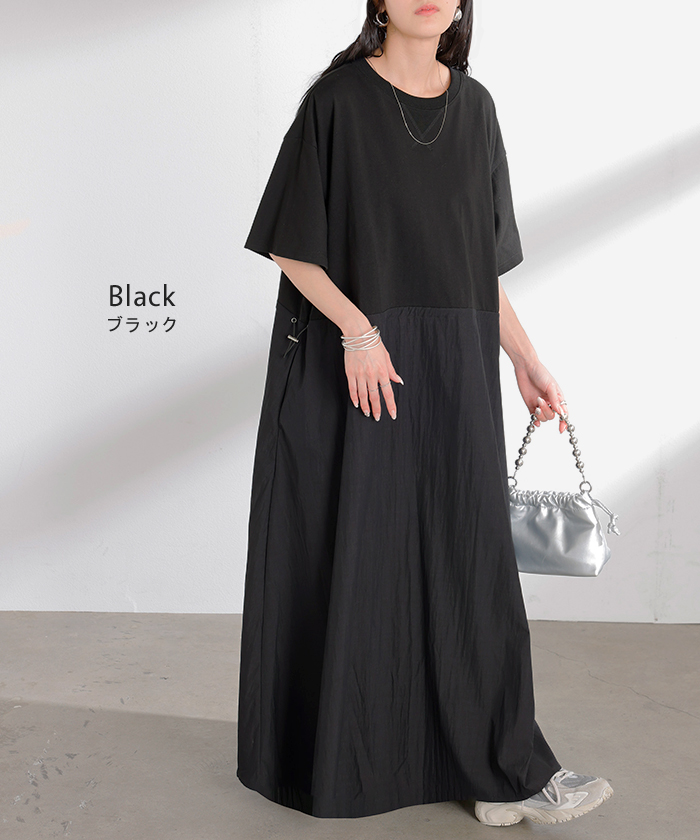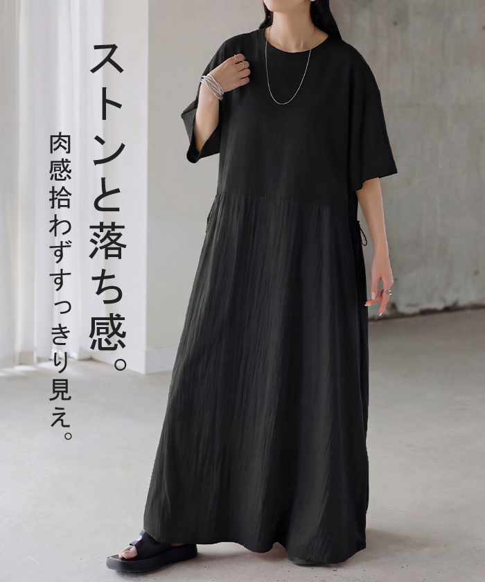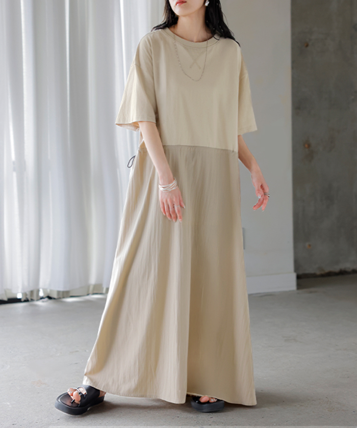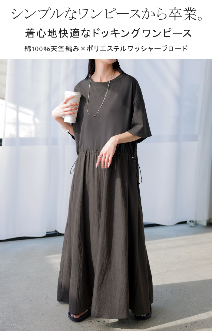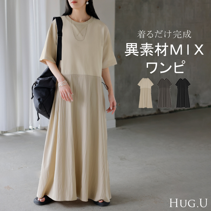 2026SS新作 ワンピース ロング 異素材 MIX ■4月下旬入荷 レディース ワンピ ロングワンピース Aライン マキシ マキシワンピース ドロスト 裾ドッキング 綿100 ワッシャー 軽い 薄手 大判 無地 半袖 通気性 ストレッチ 体型カバー 二の腕カバー 大きいサイズ 黒 ベージュ 春 夏 HUG.U