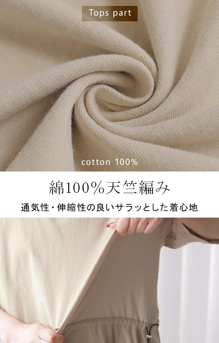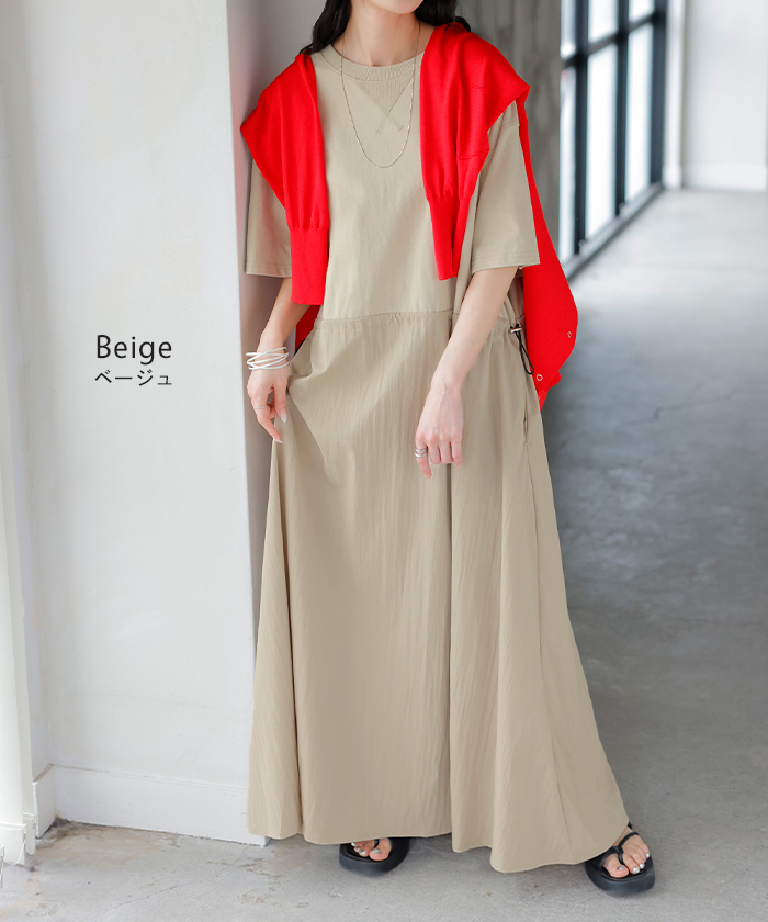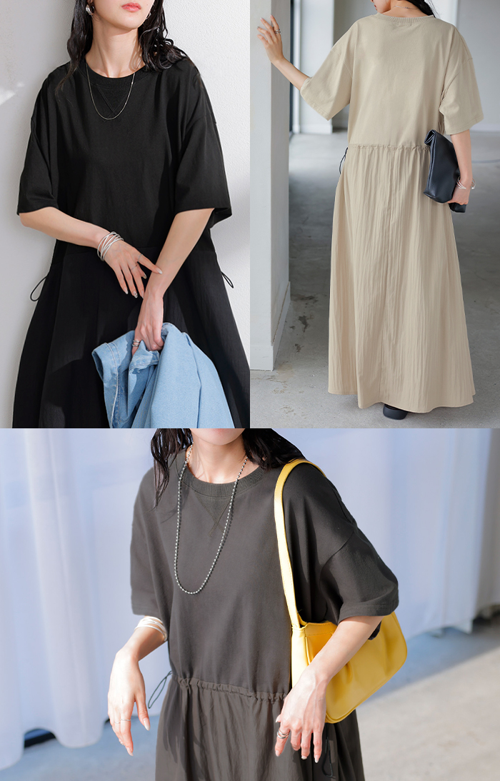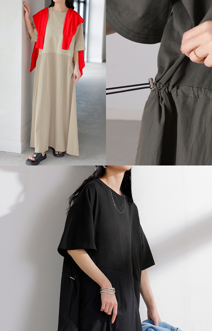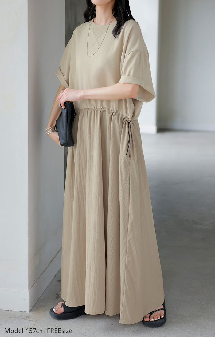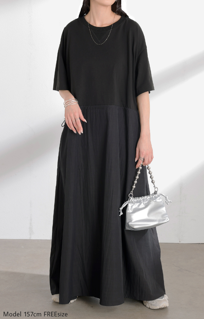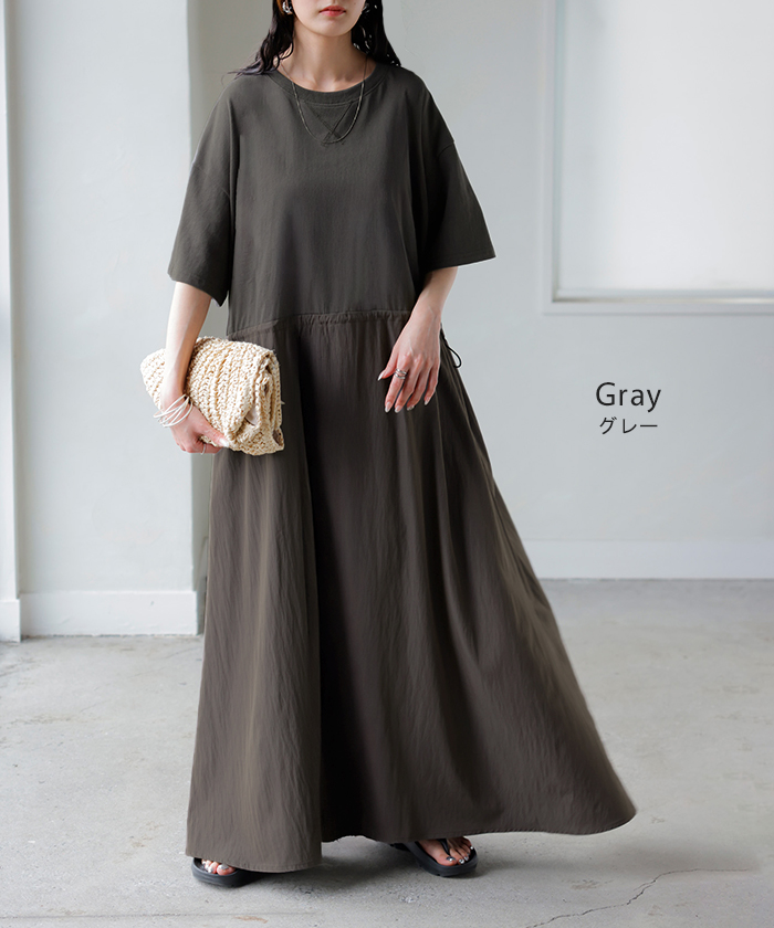 2026SS新作 ワンピース ロング 異素材 MIX ■4月下旬入荷 レディース ワンピ ロングワンピース Aライン マキシ マキシワンピース ドロスト 裾ドッキング 綿100 ワッシャー 軽い 薄手 大判 無地 半袖 通気性 ストレッチ 体型カバー 二の腕カバー 大きいサイズ 黒 ベージュ 春 夏 HUG.U