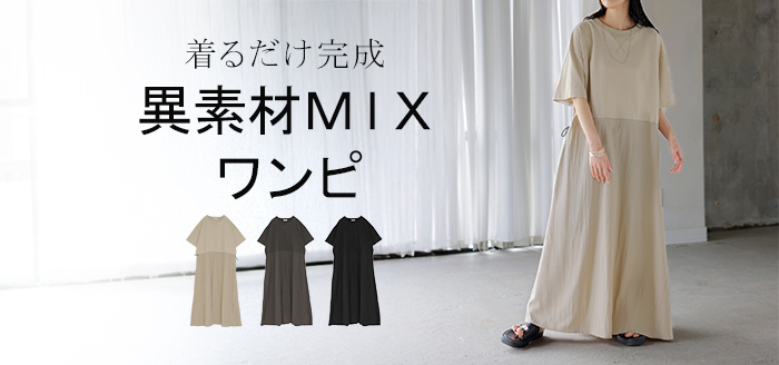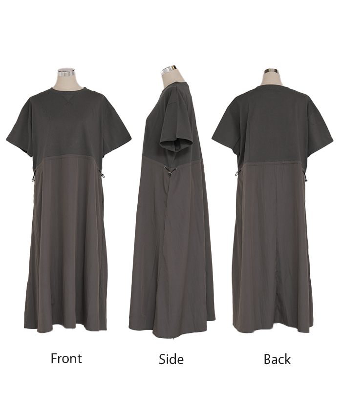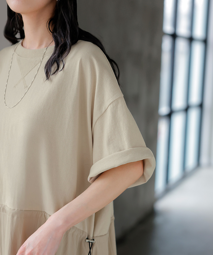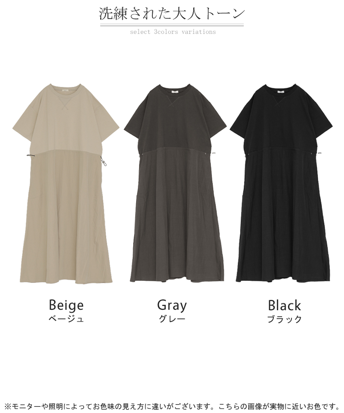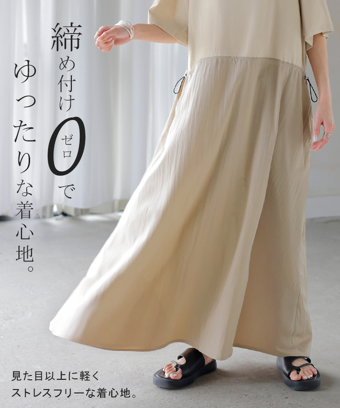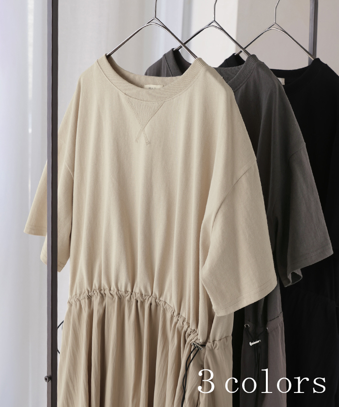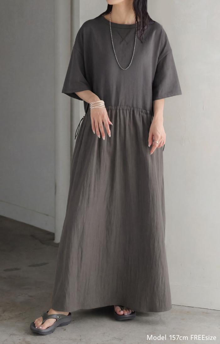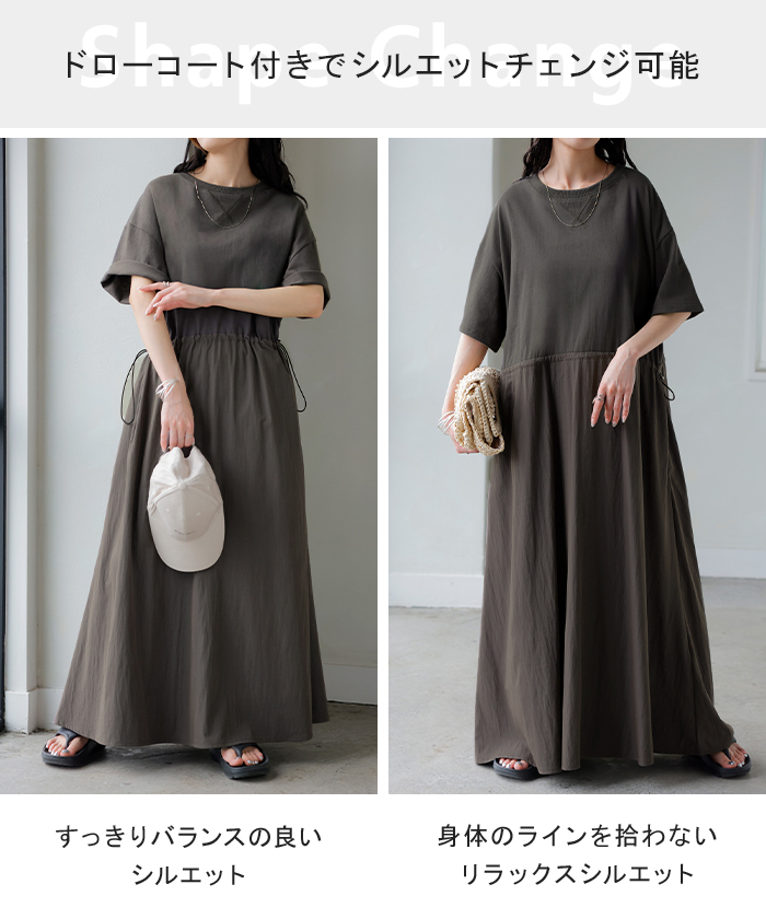 2026SS新作 ワンピース ロング 異素材 MIX ■4月下旬入荷 レディース ワンピ ロングワンピース Aライン マキシ マキシワンピース ドロスト 裾ドッキング 綿100 ワッシャー 軽い 薄手 大判 無地 半袖 通気性 ストレッチ 体型カバー 二の腕カバー 大きいサイズ 黒 ベージュ 春 夏 HUG.U