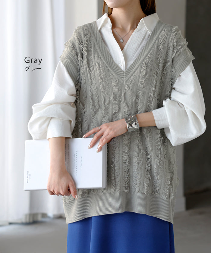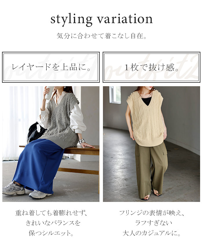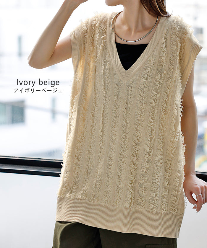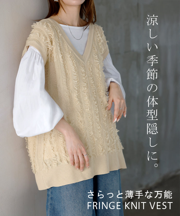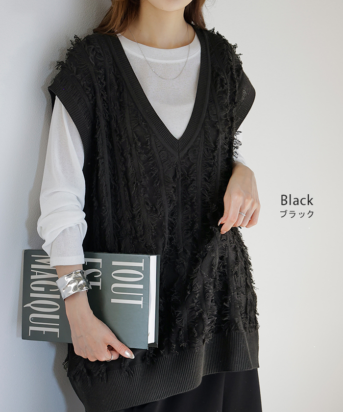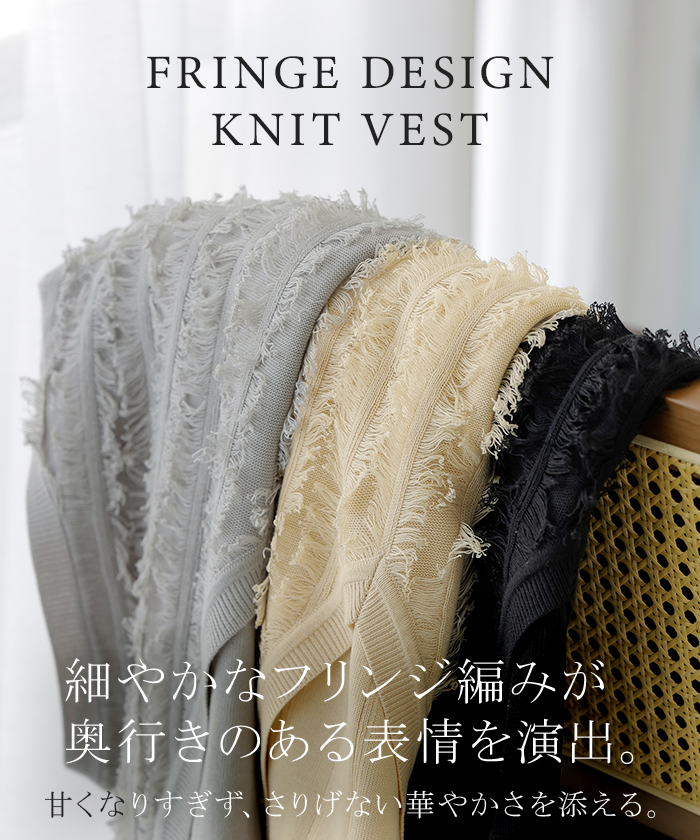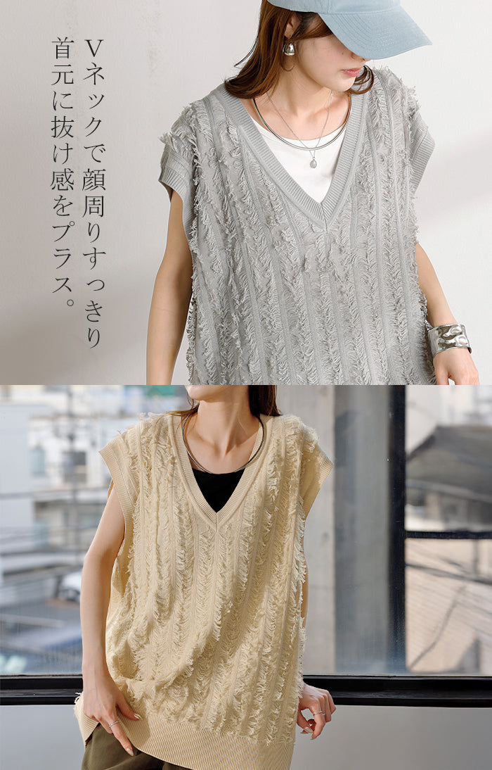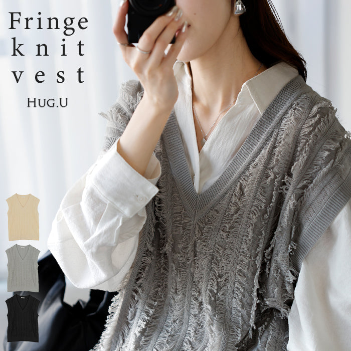 【早割10%OFF】 2026SS新作 ベスト ニット フリンジ ■2月下旬入荷 レディース トップス ロング ニットベスト レイヤード Vネック ロングベスト ノースリーブ チュニック リブ サマーニット 薄手 重ね着 カジュアル きれいめ ゆったり 体型カバー 大きいサイズ お尻が隠れる グレー 黒 春 夏 HUG.U