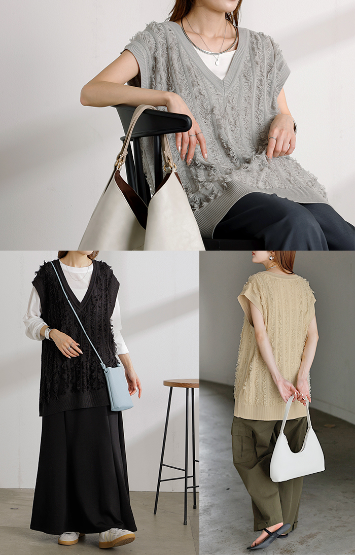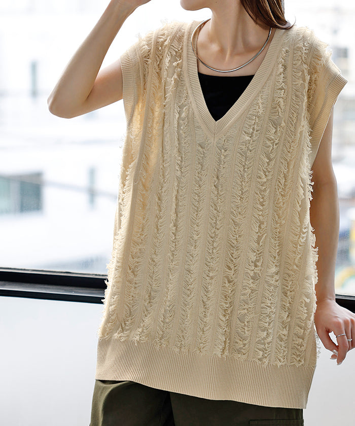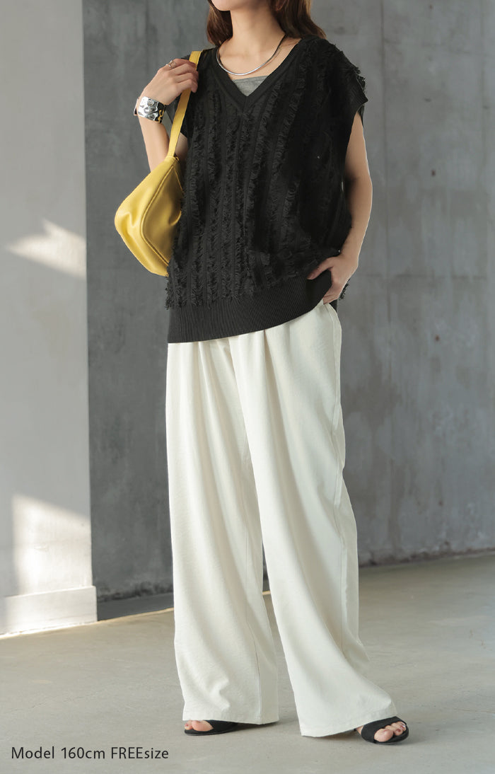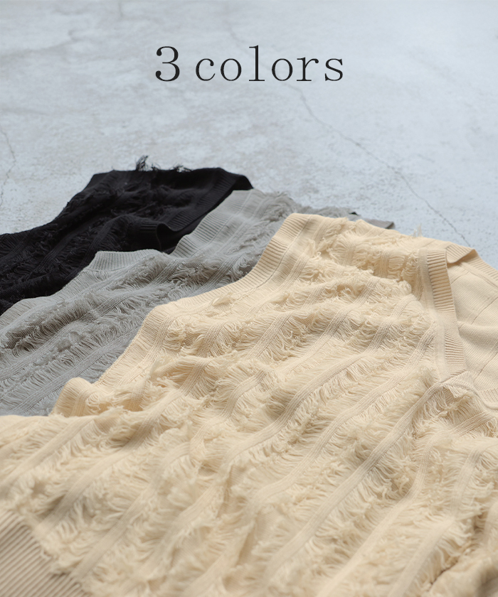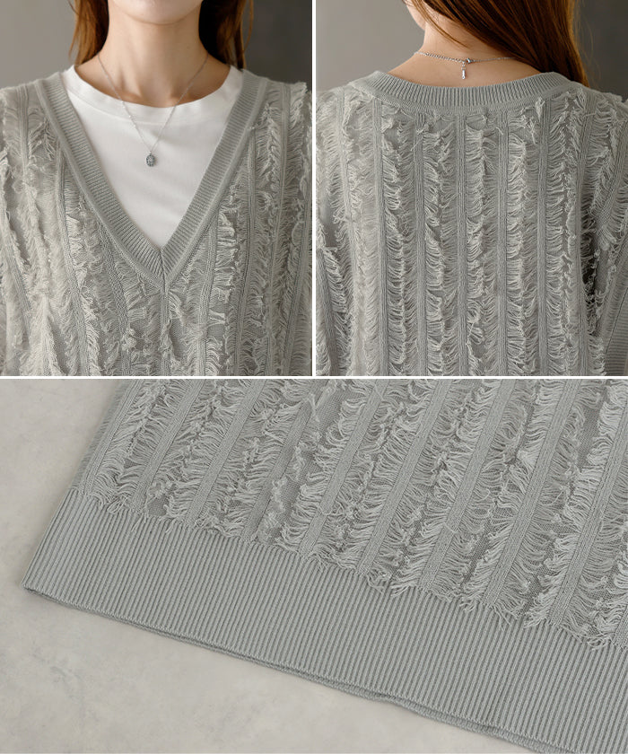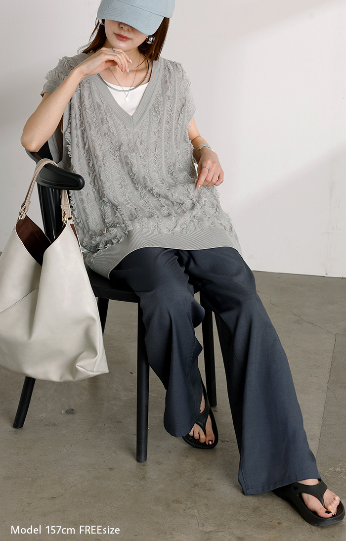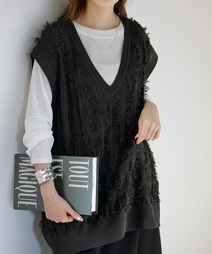 【早割10%OFF】 2026SS新作 ベスト ニット フリンジ ■2月下旬入荷 レディース トップス ロング ニットベスト レイヤード Vネック ロングベスト ノースリーブ チュニック リブ サマーニット 薄手 重ね着 カジュアル きれいめ ゆったり 体型カバー 大きいサイズ お尻が隠れる グレー 黒 春 夏 HUG.U