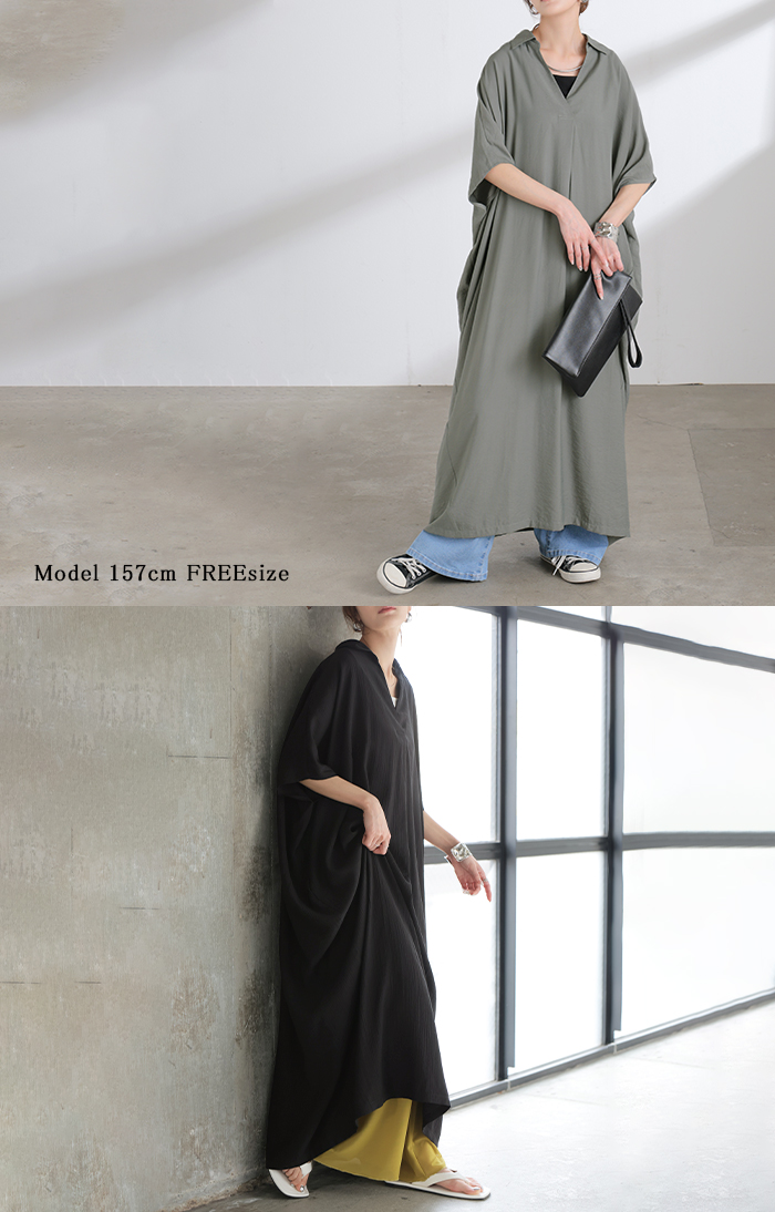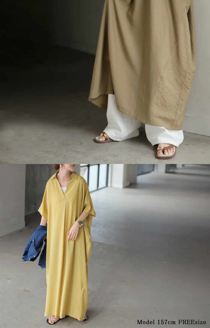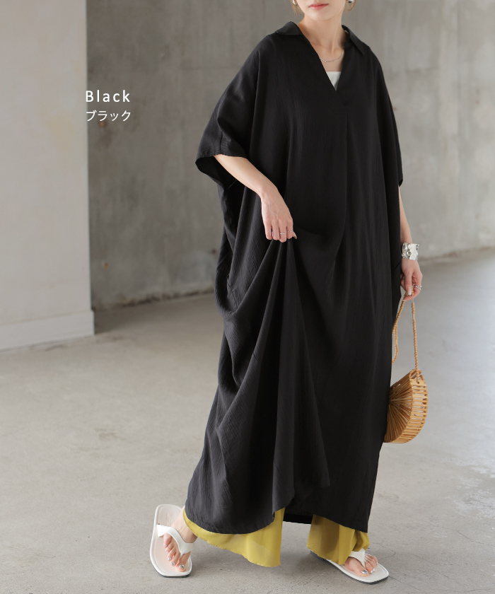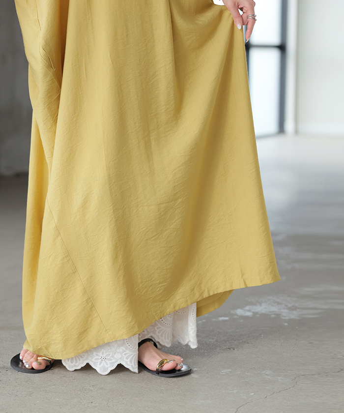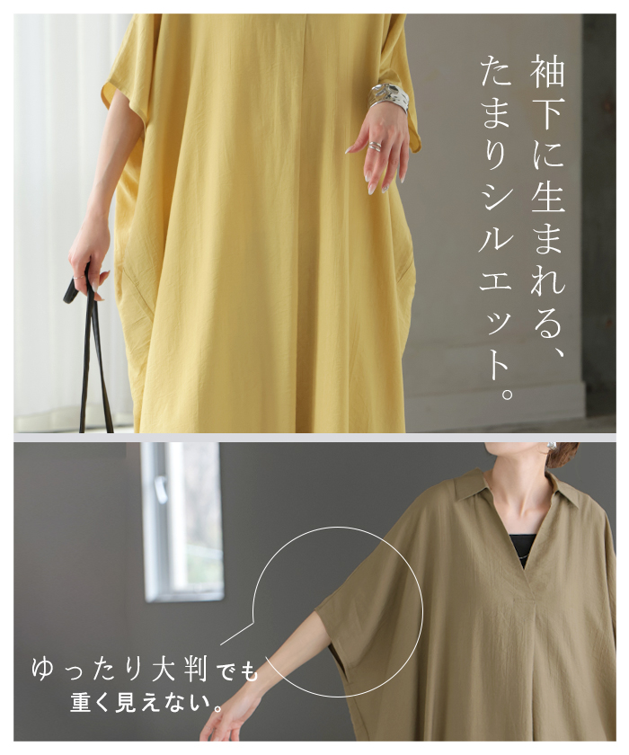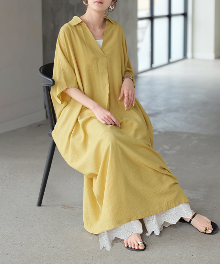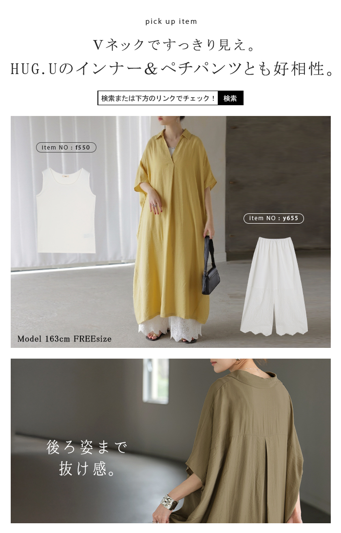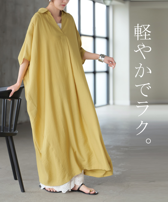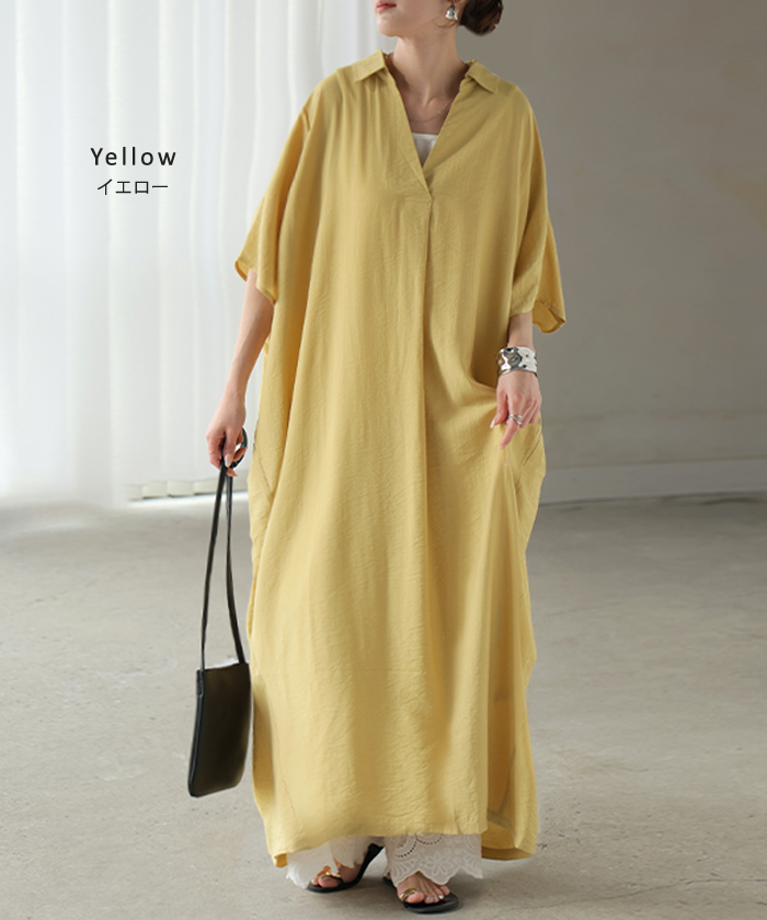 2026SS新作 ワンピース シャツワンピース ■4月下旬入荷 ロングワンピース レディース ワンピ ロング 半袖 Vネック 二の腕カバー 重ね着 レイヤード フレア Aライン 無地 薄手 ナチュラル オーバーサイズ 体型カバー ゆったり きれいめ 大きいサイズ ブラック イエロー 春 夏 HUG.U