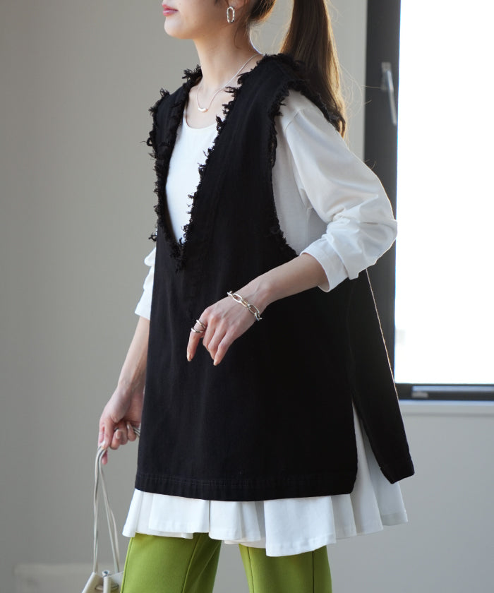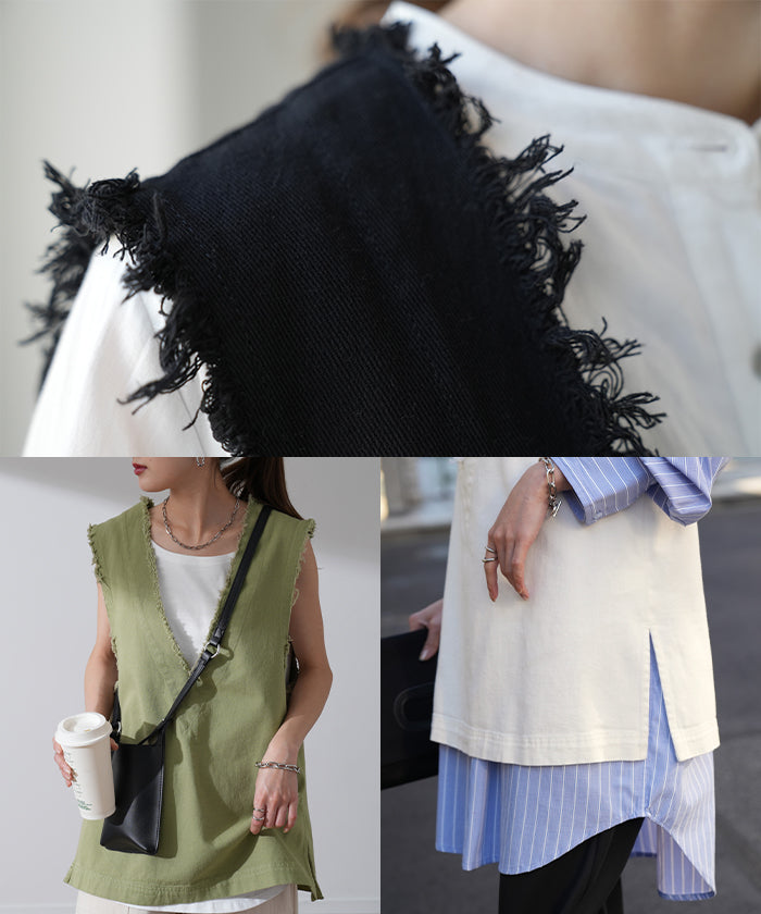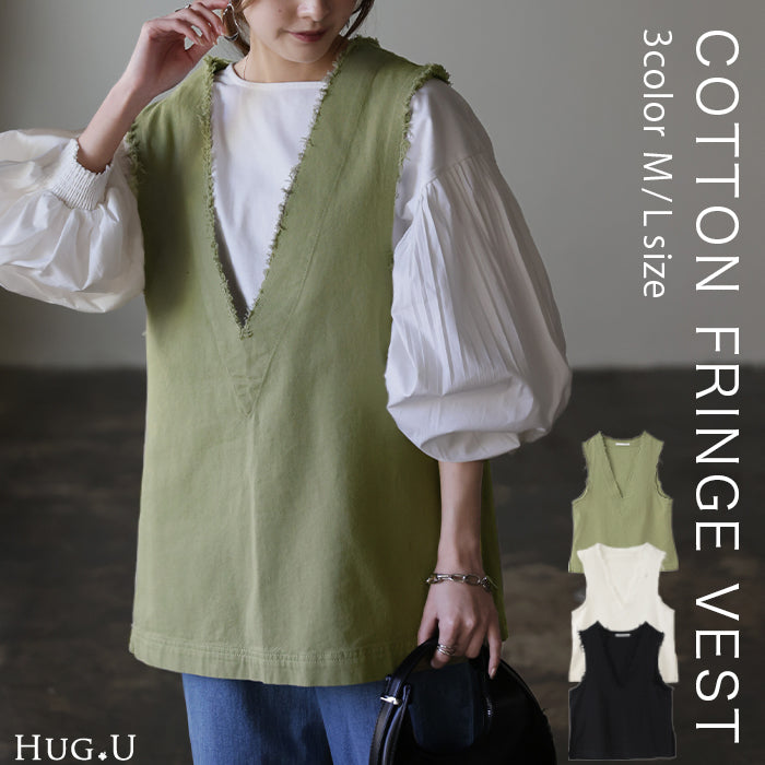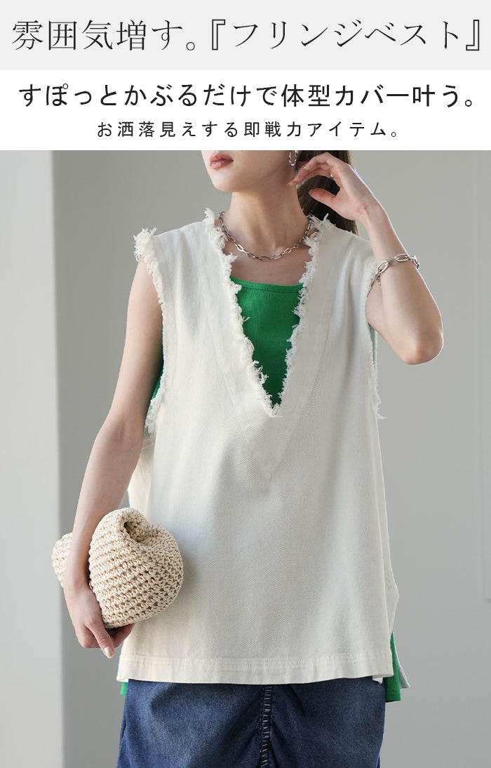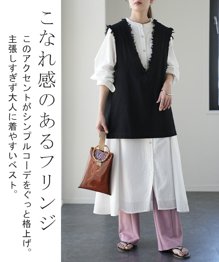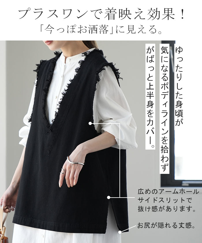 今っぽ 「 重ねて 体型カバー 」フリンジ ベスト チュニック フリンジベスト 綿100 レディース レイヤード トップス ロング スリット 深Vネック 重ね着 Vネック お洒落 袖なし お尻が隠れる 薄手 ジレ ビッグ 黒 ブラック 大きいサイズ 春 夏 HUG.U メール便