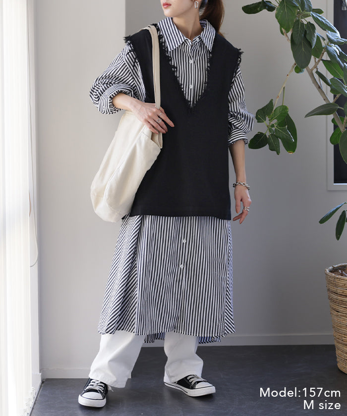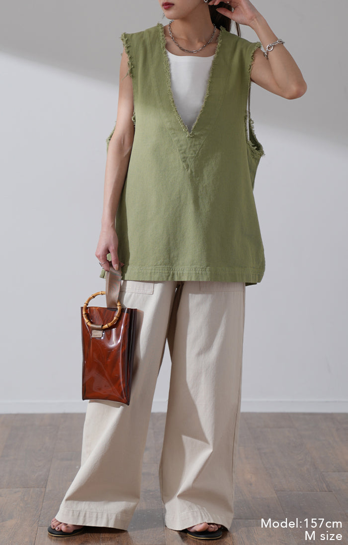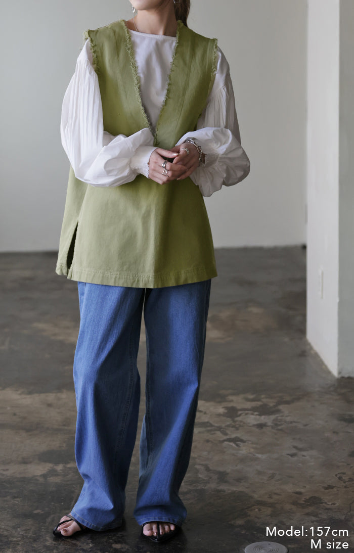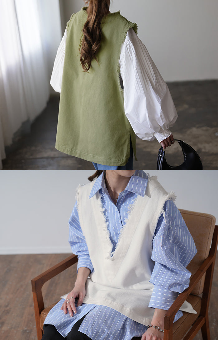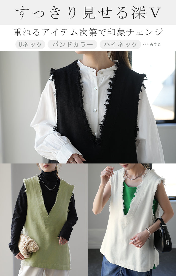 着るだけで旬な印象にしてくれるトレンドライクな深Vネックベストです。ワンピースの上に重ねたりカットソー合わせでカジュアルに着たりと着回し力抜群。身幅も細すぎず自由自在にレイヤードスタイルを楽しめます。