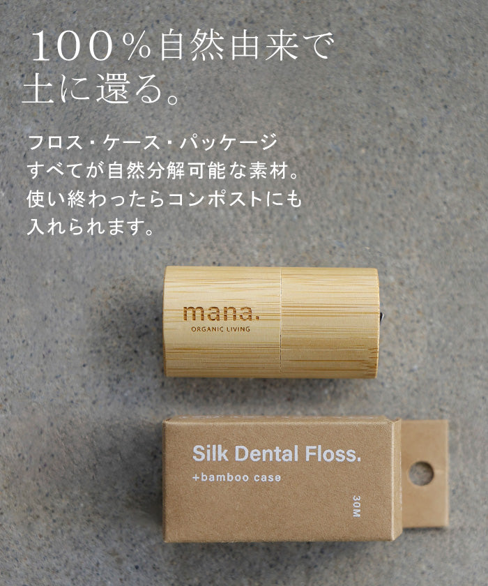 フロス、ケース、パッケージ全てが自然分解可能な素材。土に還るので、使い終わったら自宅のコンポストにも入れられます。