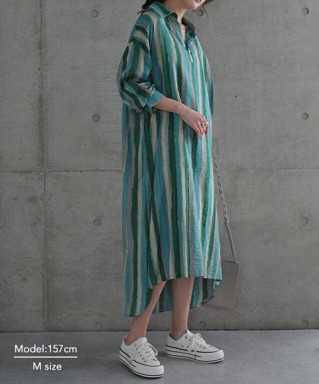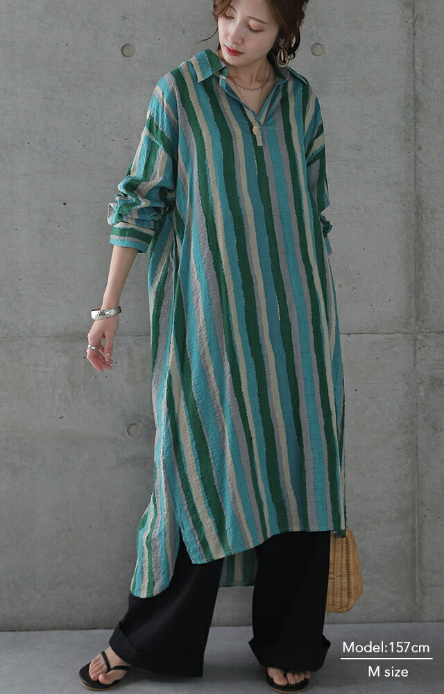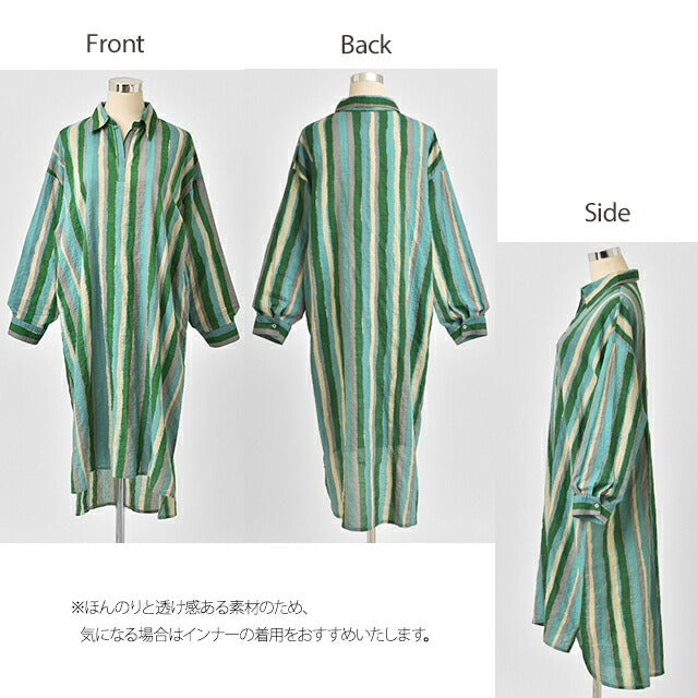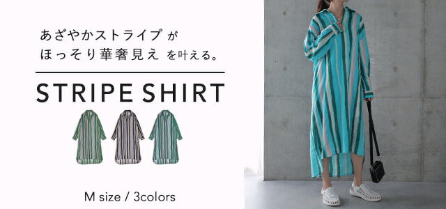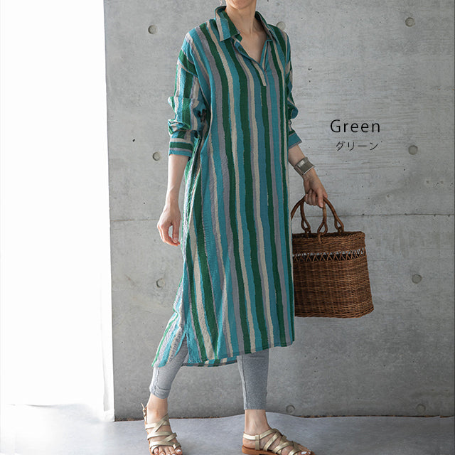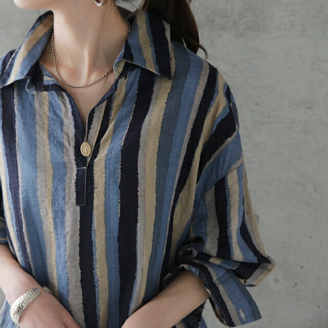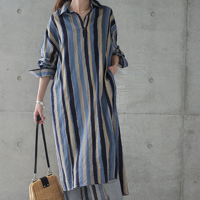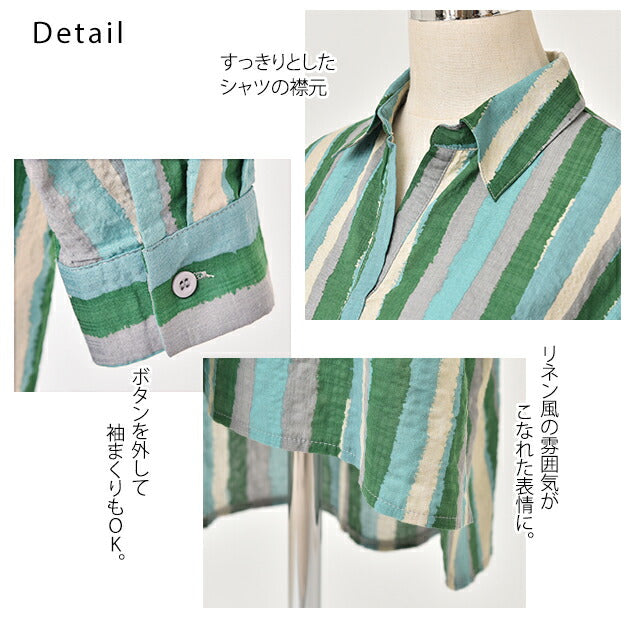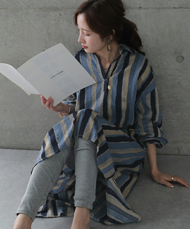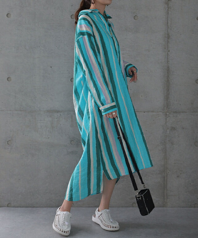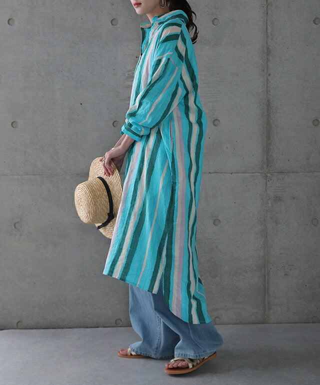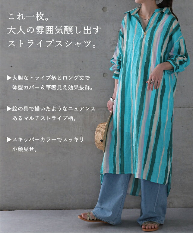 1枚で印象が変わるアーティスティックなストライプ柄のリネン風ロングシャツ。スタンダートな形でのコーデも楽ちん、抜き襟風に着るものおすすめです。後が長いデザインで脚を綺麗に見せてくれて、ストライプ柄で細見え効果にも期待できます。