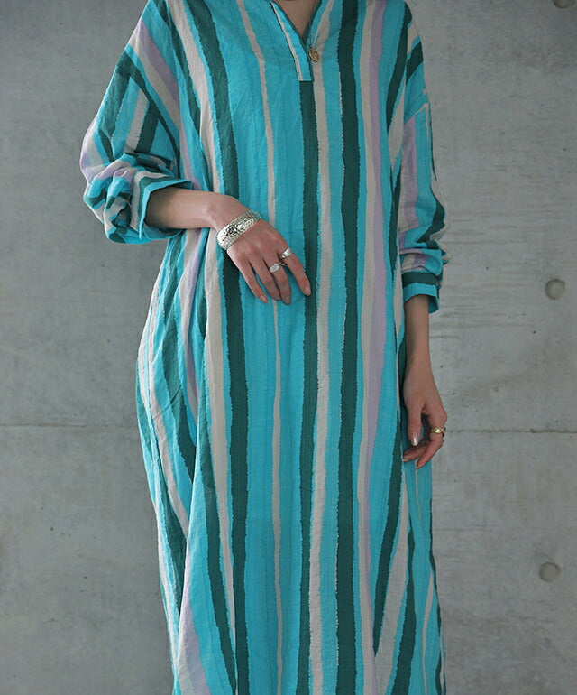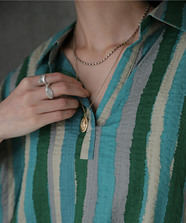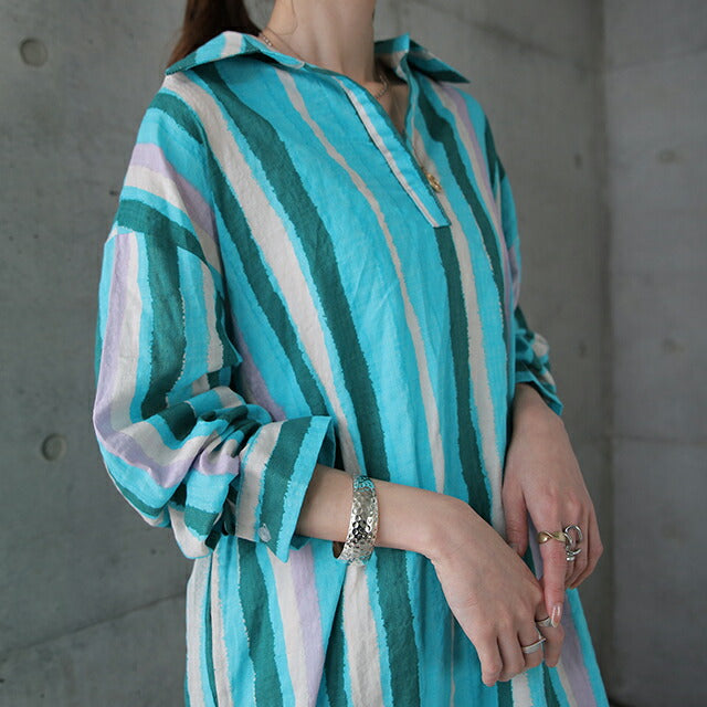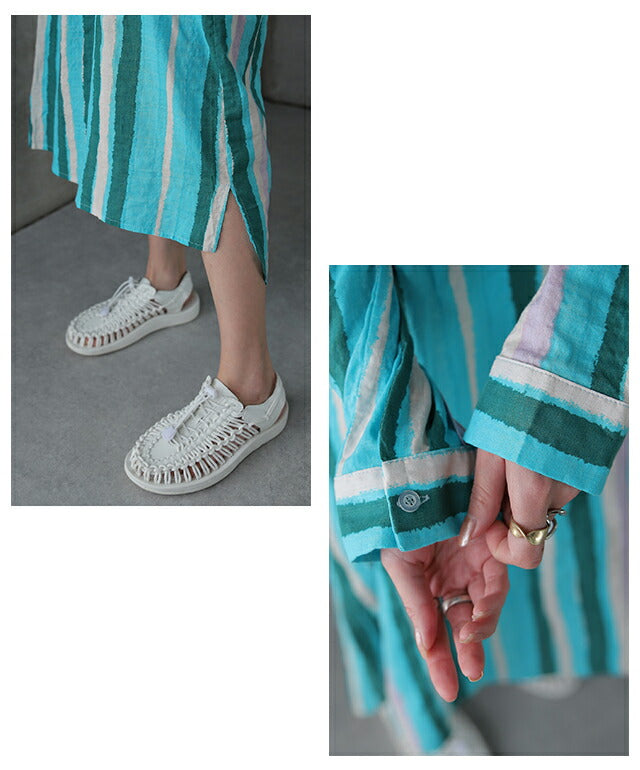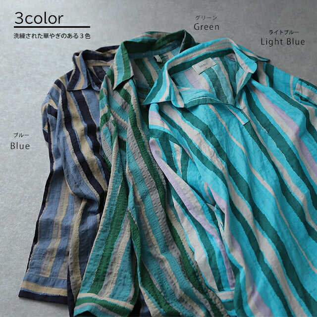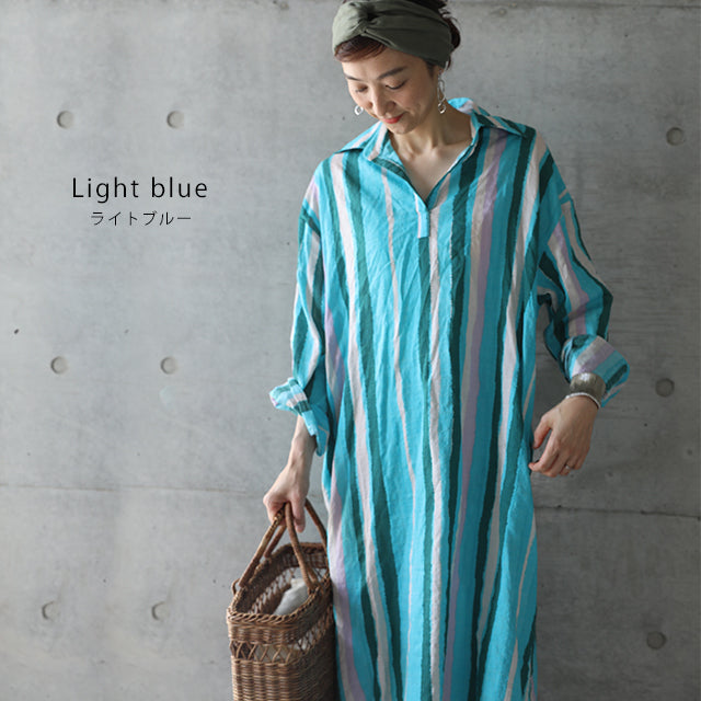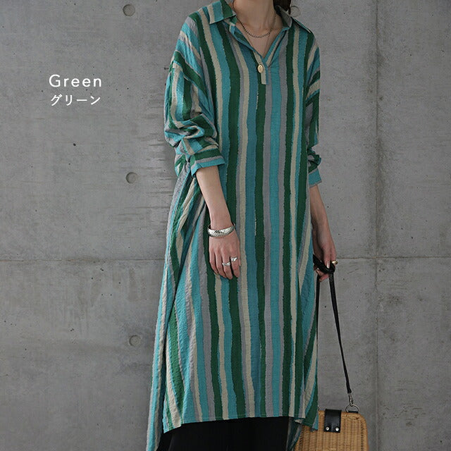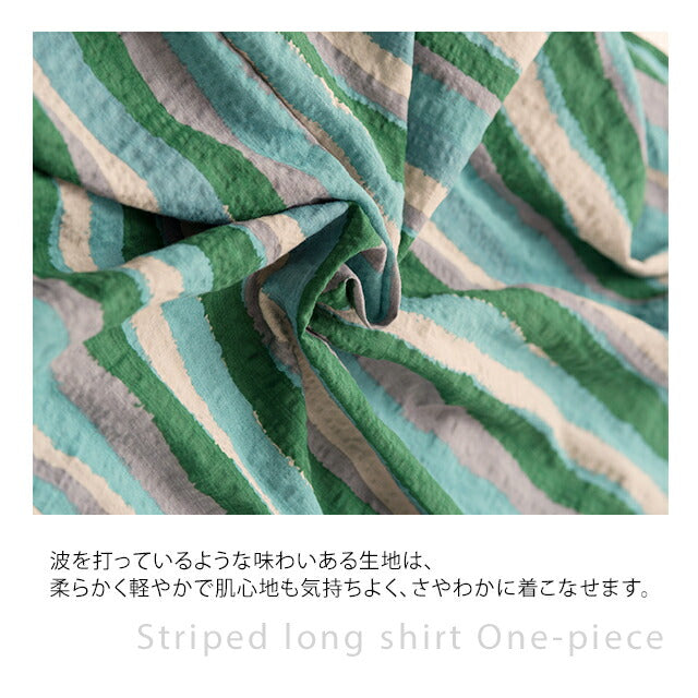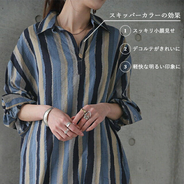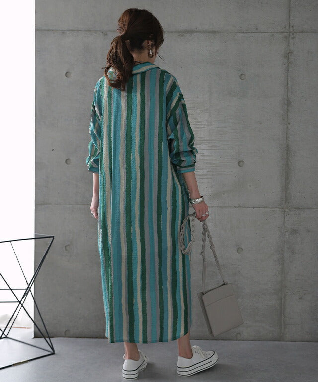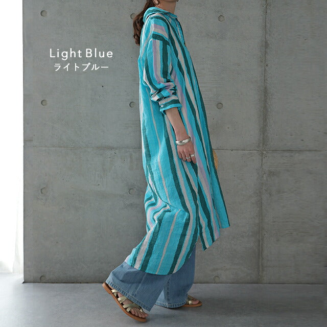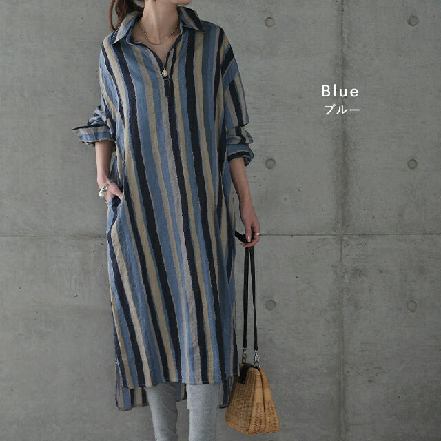 1枚で印象が変わるアーティスティックなストライプ柄のリネン風ロングシャツ。スタンダートな形でのコーデも楽ちん、抜き襟風に着るものおすすめです。後が長いデザインで脚を綺麗に見せてくれて、ストライプ柄で細見え効果にも期待できます。