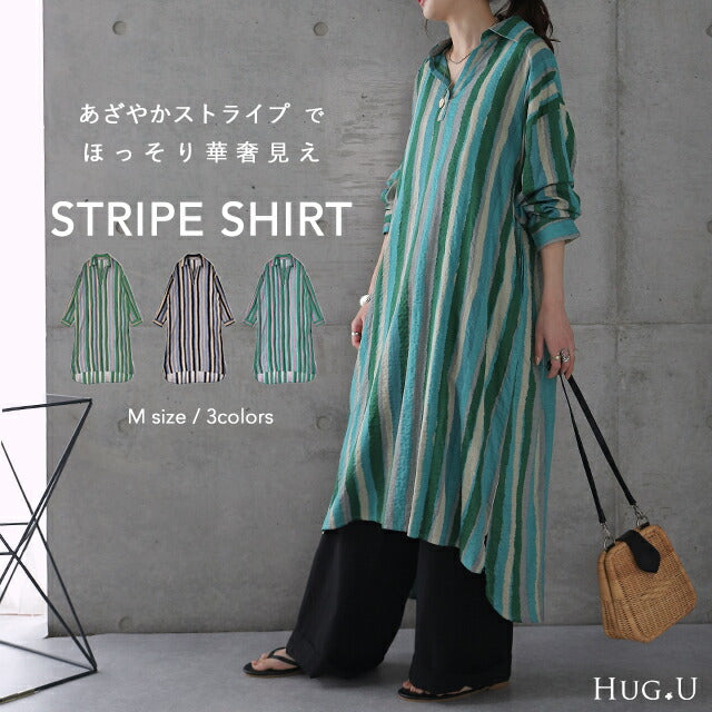 シャツワンピース ワンピース レディース シャツ ロングシャツ ロングシャツワンピース ワンピ ストライプ スキッパーシャツ 長袖 体型カバー ロング 大きいサイズ マキシワンピース マキシ 2L 3L マタニティ 春 夏 HUG.U メール便